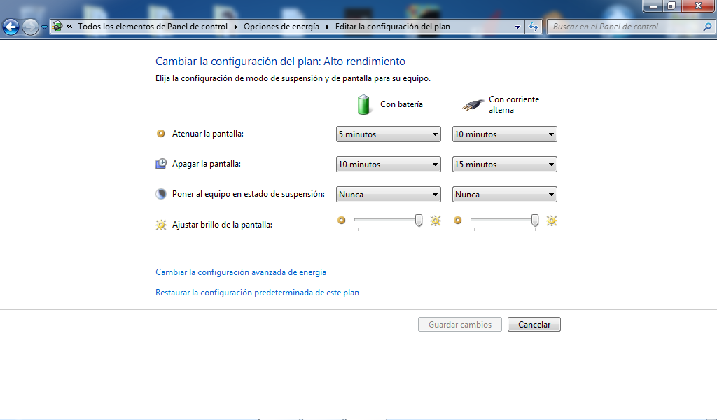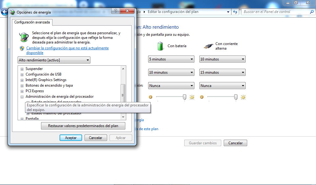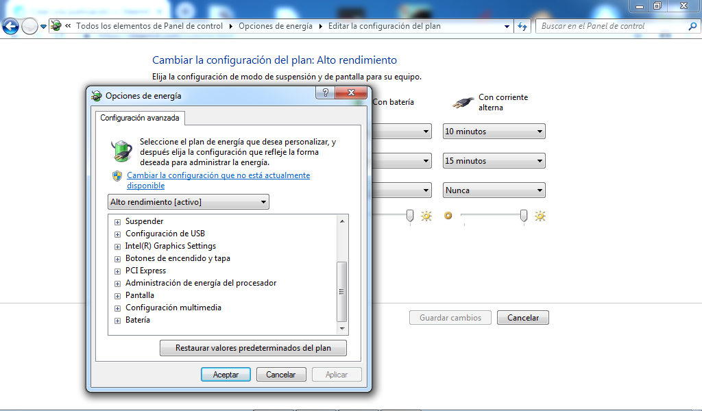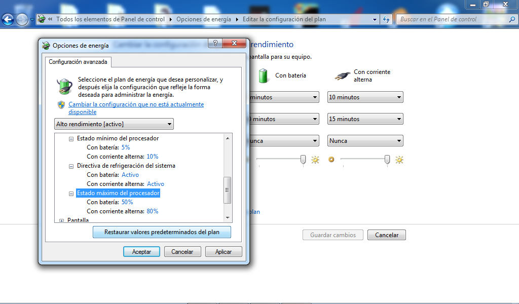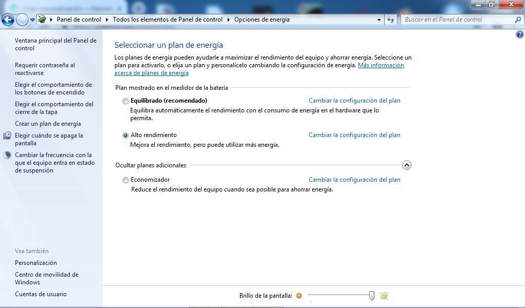 Luego en la opción de plan de energía seleccionamos el plan de Alto Rendimiento y en Cambiar la Configuración del Plan