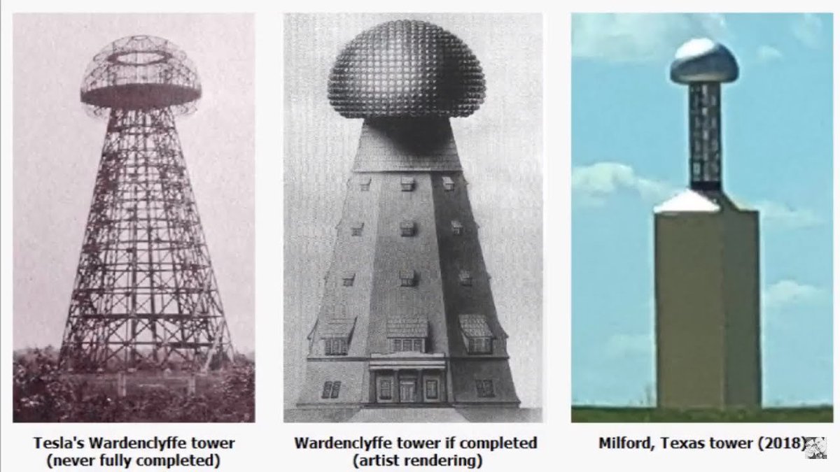 Tesla's mode of wireless transmission seems to rely on the capacitor plate at the top, acting on hydrogen ions in the atmosphere, that can propagate a force between towers at any distance, as well as potentially propagating the electrostatic movement via ionosphere. Since it requires a capacitor to be "elastic" enough to transmit the alternating current back and forth, it also needs to have an inductor so that the reactance can be neutralized. And, with that, it can transmit electricity through a single wire conductor, in the case of his global "wireless" system, the Earth ground itself.