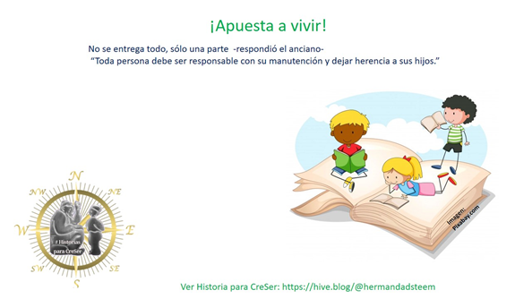 No se entrega todo, sólo una parte -respondió el anciano- toda persona debe ser responsable con su manutención y dejar herencia a sus hijos; tanto moral, como en bienes terrenales. Sí, cada uno de nosotros debemos laborar y apartar para nuestro bienestar en medida frugal; y asegurar la verdadera fortuna, que está en la eternidad, mediante actos de bondad desapegados.
