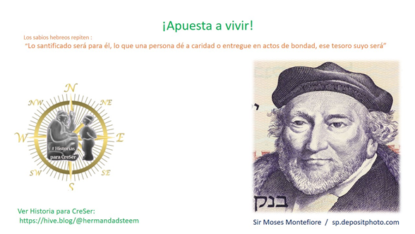 Ven, escucha lo que recuerdo de Sir Moses Montefiore, conocido como “El Protector” De Joven Montefiore inició a ser corredor de bolsa en Londres, a través de los años amasó una gran fortuna personal, llegando a ser miembro de la aristocracia en Inglaterra. En cierta ocasión la reina Victoria le pregunto, ¿Cuál era el alcance de su riqueza, cuánto es lo que en verdad posee?