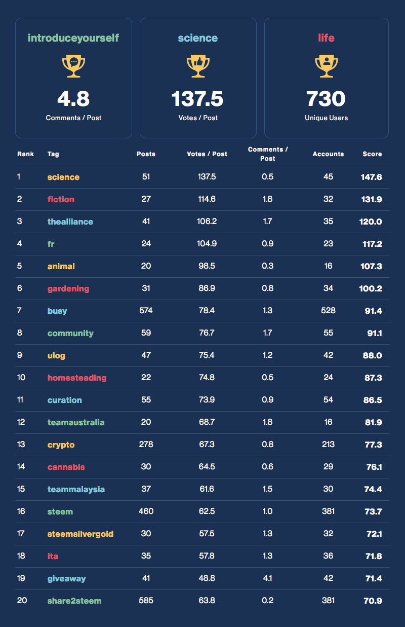 Each day we award and rank the top performing tags across the Steem ecosystem in terms of community activity. Find which tags are your best opportunity to connect to your community!