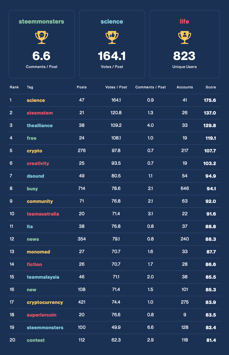 Each day we award and rank the top performing tags across the Steem ecosystem in terms of community activity. Find which tags are your best opportunity to connect to your community!
