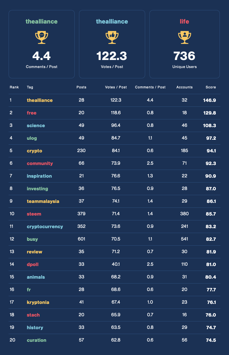 Each day we award and rank the top performing tags across the Steem ecosystem in terms of community activity. Find which tags are your best opportunity to connect to your community!