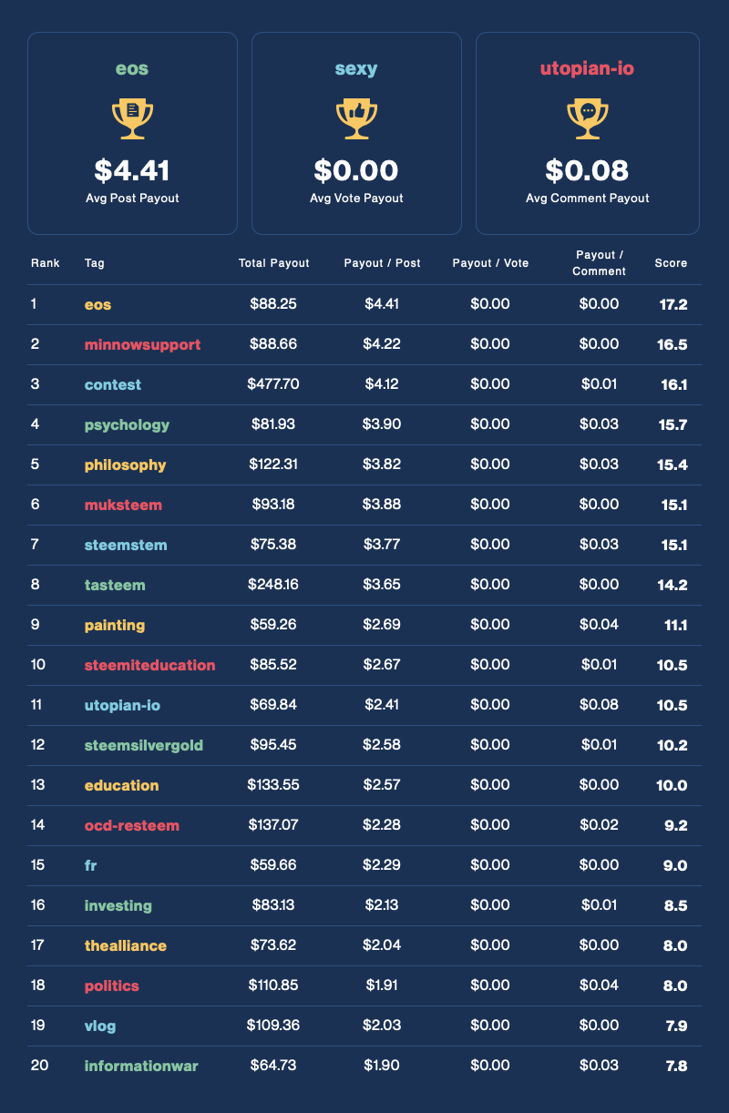 Each day we award and rank the top performing tags across the Steem ecosystem in terms of financial opportunity. Find which tags are your best opportunity to make rewards!