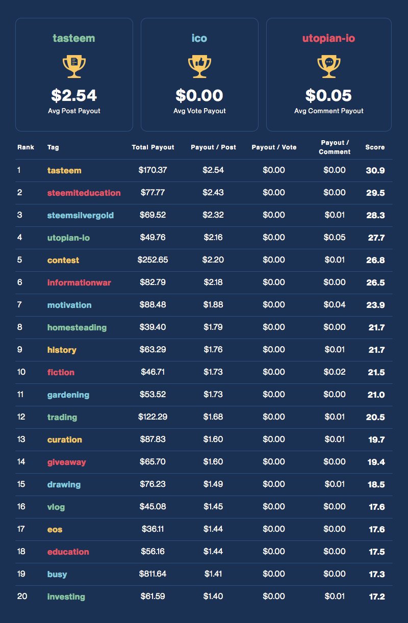Each day we award and rank the top performing tags across the Steem ecosystem in terms of financial opportunity. Find which tags are your best opportunity to make rewards!