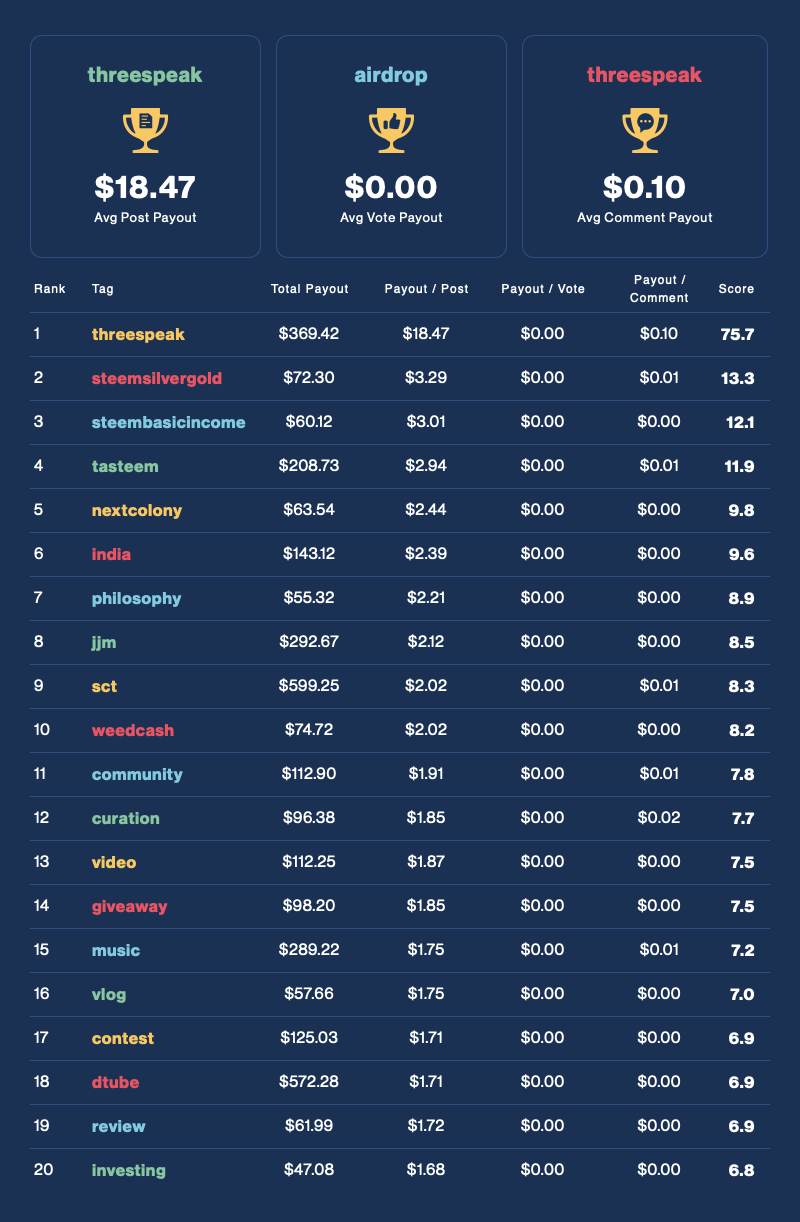 Each day we award and rank the top performing tags across the Steem ecosystem in terms of financial opportunity. Find which tags are your best opportunity to make rewards!
