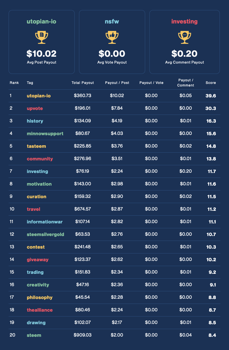 Each day we award and rank the top performing tags across the Steem ecosystem in terms of financial opportunity. Find which tags are your best opportunity to make rewards!