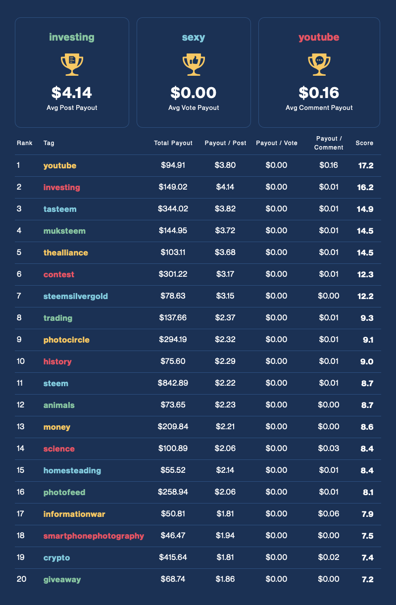 Each day we award and rank the top performing tags across the Steem ecosystem in terms of financial opportunity. Find which tags are your best opportunity to make rewards!