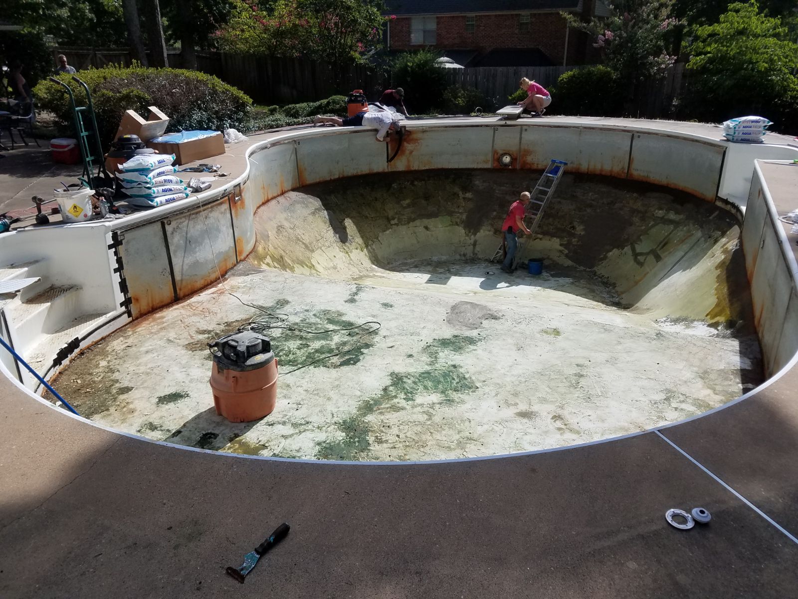This week my crew worked on a 30 year old Foxx pool in the Pleasant Grove area of Texarkana, Texas. The Pool was in pretty rough shape. Required fiberglass to repair the cracked steps and plenty of floor work to repair crackes and divots.