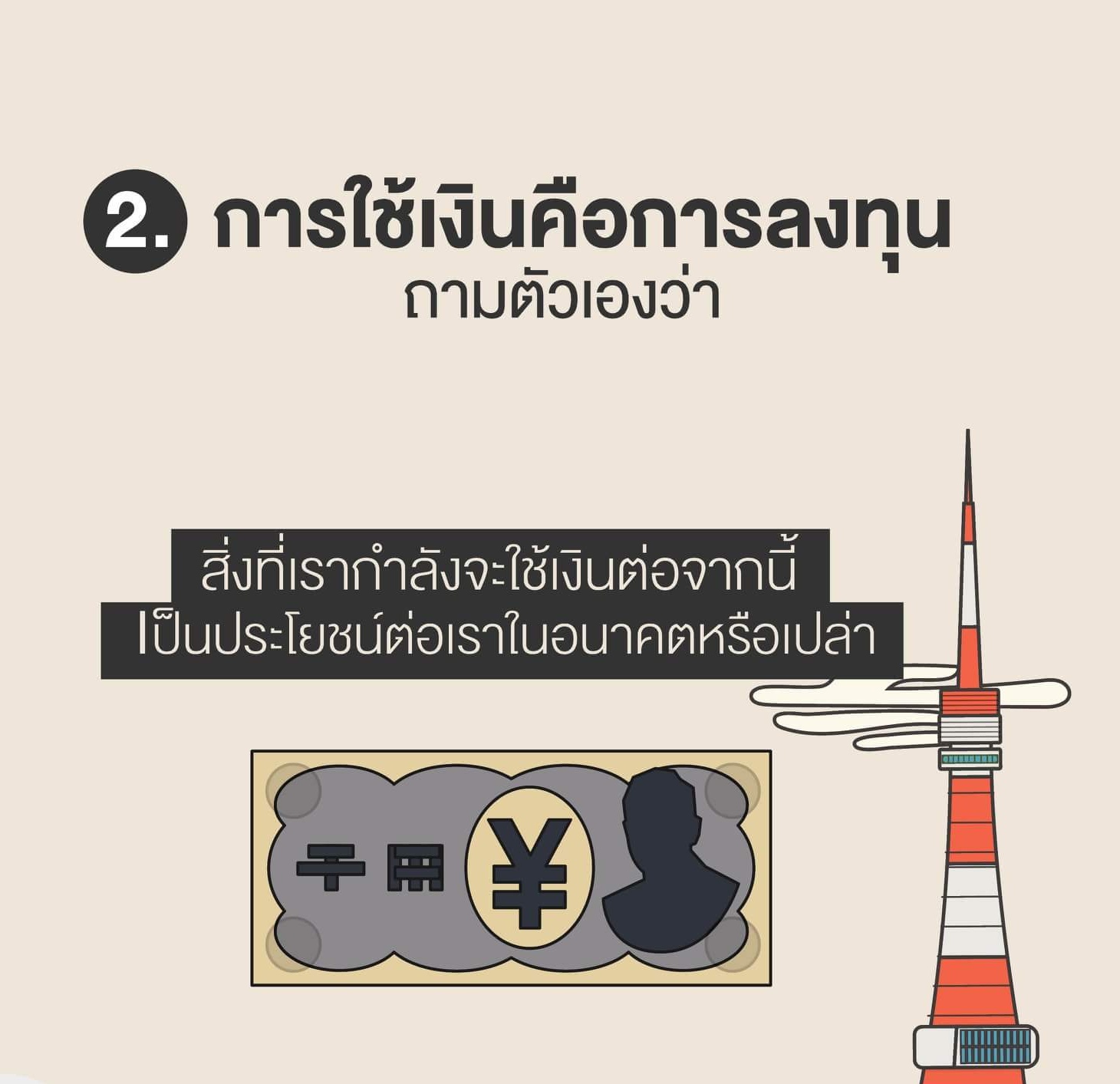 จงถามตัวเองทุกครั้งก่อนจะซื้อของว่า ของที่ตัวเองจะซื้อนั้นมีประโยชน์จริงหรือเปล่า และเราจะได้อะไรกลับมาในอนาคต ไม่ว่าของสิ่งนั้นจะมีราคาถูกหรือแพง เช่น การที่เราตัดสินใจเสียเงิน 200 บาทขึ้นรถแท็กซี่แทนที่จะเสีย 13 บาทขึ้นรถประจำทางนั้น มีประโยชน์ต่อตนเองจริงหรือเปล่า หากนั่งแท๊กซี่แล้ว ตนเองมีเวลาทำจิตใจให้สงบและซักซ้อมบทสนทนาก่อนไปพบลูกค้า โอกาสที่ลูกค้าจะเซ็นสัญญากับบริษัทก็สูงขึ้น เงิน 200 บาทนั้นก็ถือเป็น “การลงทุน” ที่คุ้มค่า
