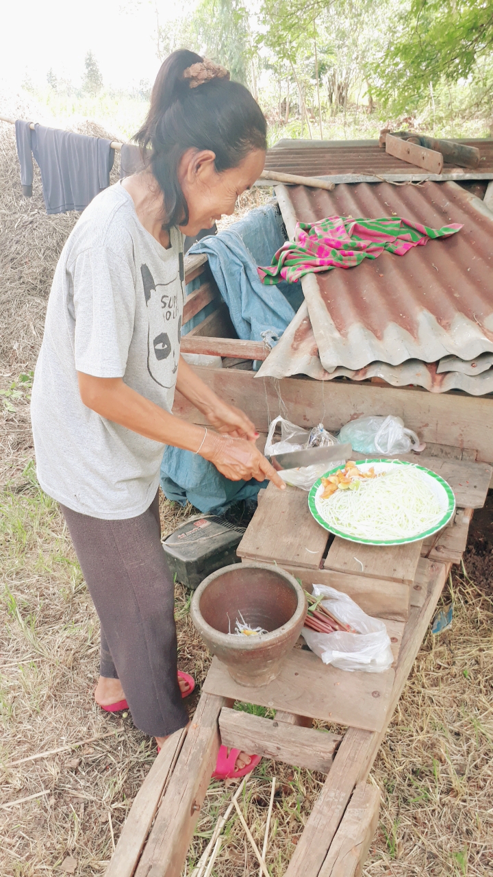 คุณย่ากำลังตำส้มตำค่ะ สูตรเด็ดใส่ดองปูนาค่ะ อร่อยที่สุดในสามโลก