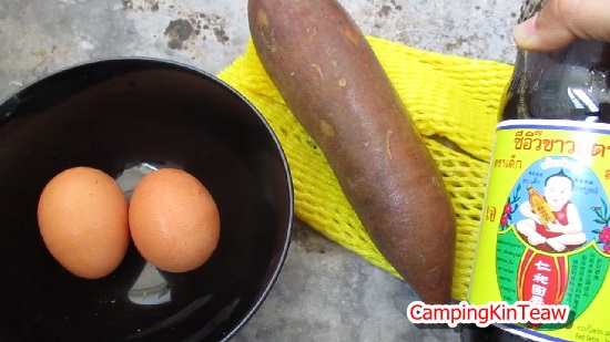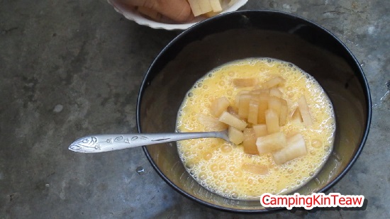 2.ตอกไข่ไก่ตีให้เกิดฟอง นำบัวหิมะและใส่ซีอิ้วขาวเล็กน้อย ตีให้เข้ากัน