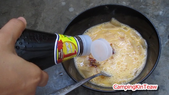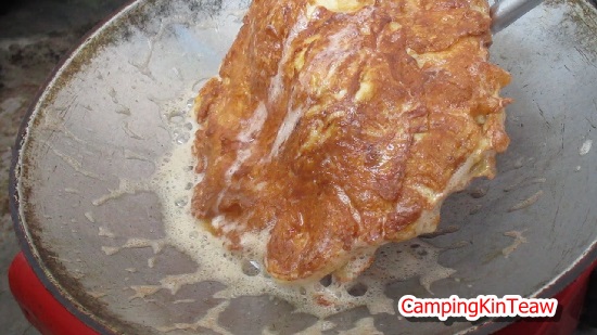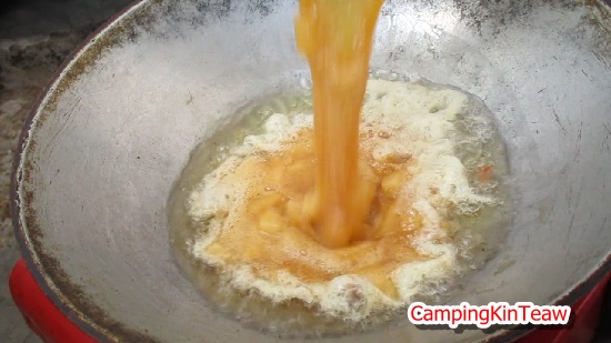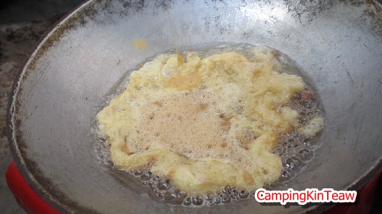 3.ตั้งกระทะใส่น้ำมันพืช รอให้น้ำมันร้อน เทไข่ลงกะทะ เจียวให้เหลือง ตักใส่จานคะ