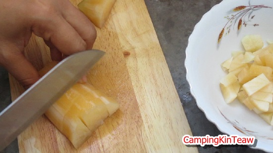 1.นำบัวหิมะมาปอกเปลือกและล้างให้สะอาด หั่นเป็นชิ้นเล็กๆ