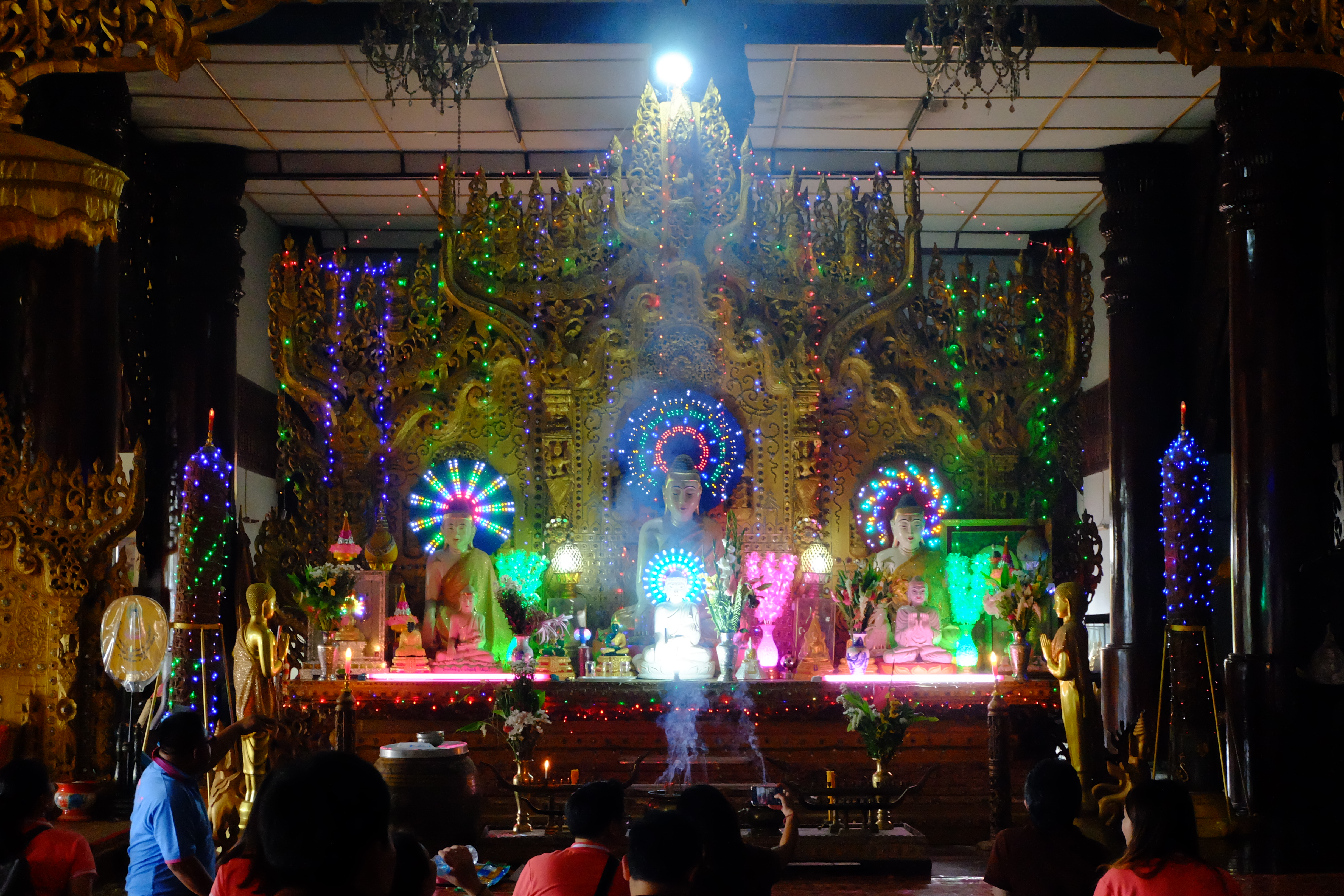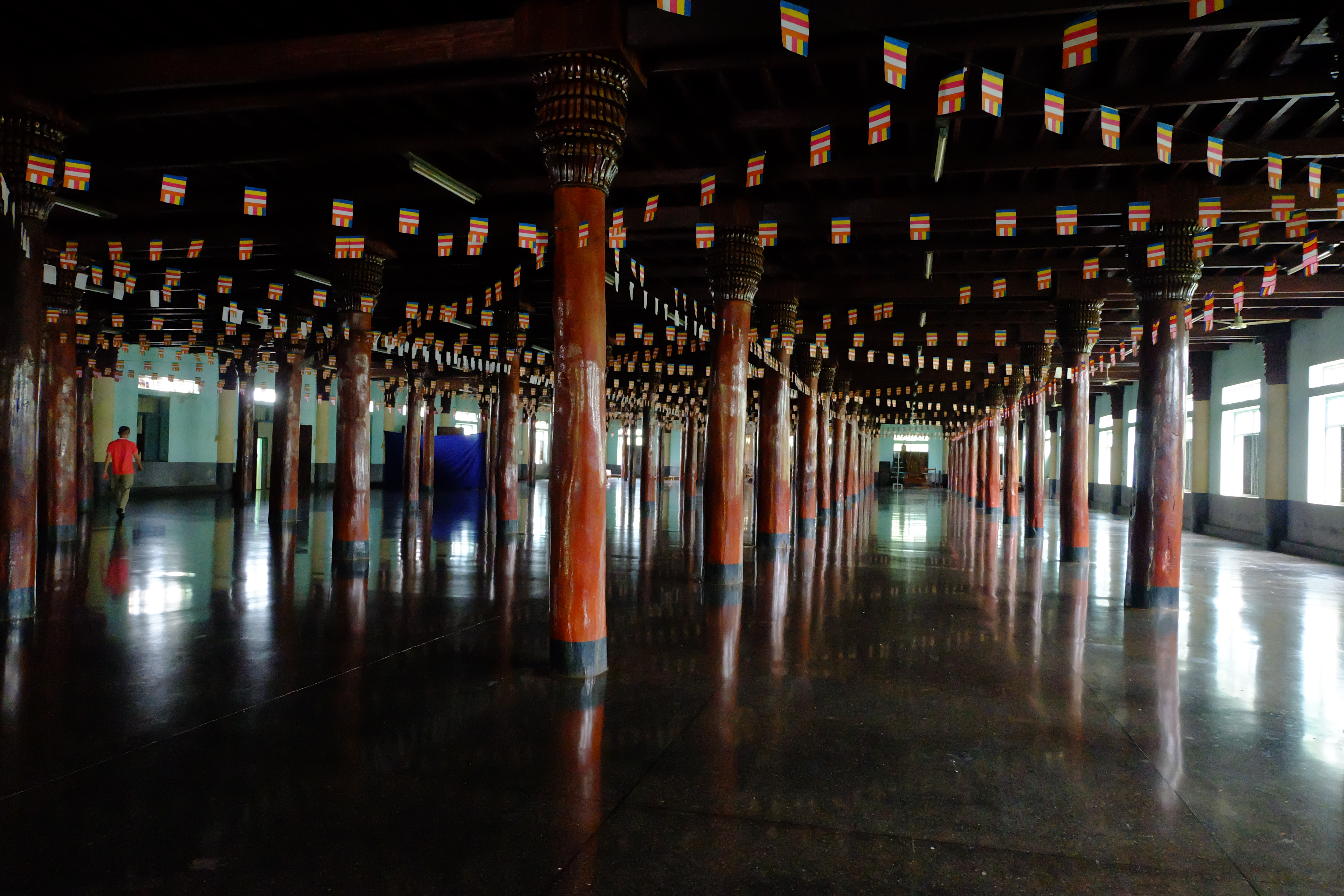 วัดนี้จะมีบริเวณกว้างใหญ่หลายร้อยไร่ แต่ตัววัดจริงๆ เป็นอาคารหลังใหญ่ดังภาพค่ะ เมื่อเดินเข้าไปข้างใน ชั้นล่างของวัดจะเห็นเป็นเสาไม้แดงเรียงรายอยู่เป็นจำนวนมาก ดังภาพ ไกด์หนุ่มน้อยชาวพม่าบอกว่ามี 105 ต้น ละมุนก็ไม่ได้นับค่ะ 555