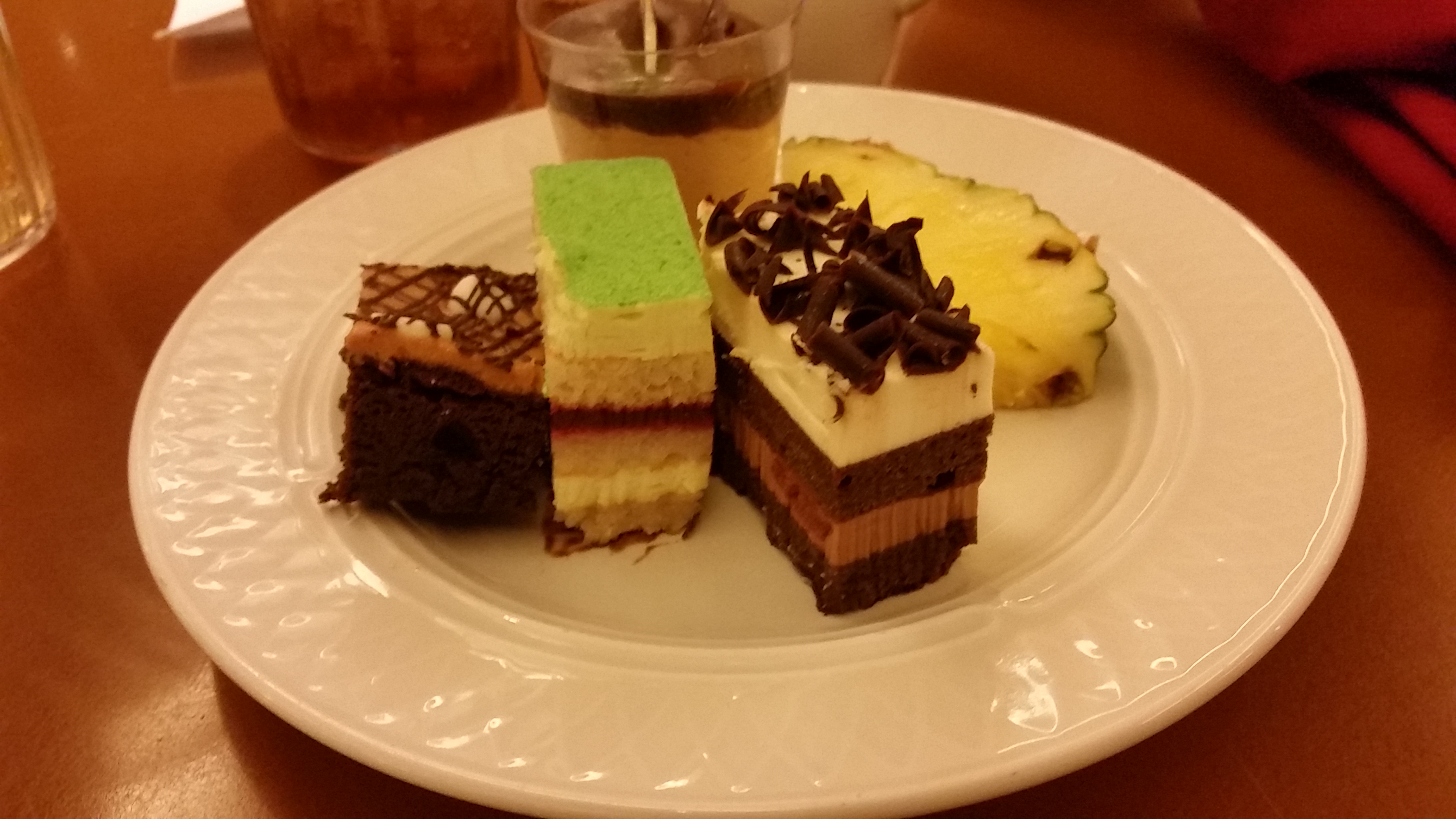 อาหารที่ทานที่บุฟเฟ่ต์ก็จะประมาณนี้ ส่วนใหญ่อาหารก็จะมีทั้งฝรั่ง เอเชียน แม๊กซิกัน และฟาสต์ฟูด เลือกกินกันได้ตามสบาย ร้านบุฟเฟ่ต์ร้านแรก มีเครื่องดื่มไวน์ เบียร์ ให้ดื่มฟรีไม่อั้นด้วย แต่พวกเราไม่ได้ดื่มหรอกค่ะ ตอนแรกกะว่าจะขอลองดื่มไวน์ขาวดู แต่พอมาเกิดอาการปวดท้อง เลยต้องยกเลิกไป