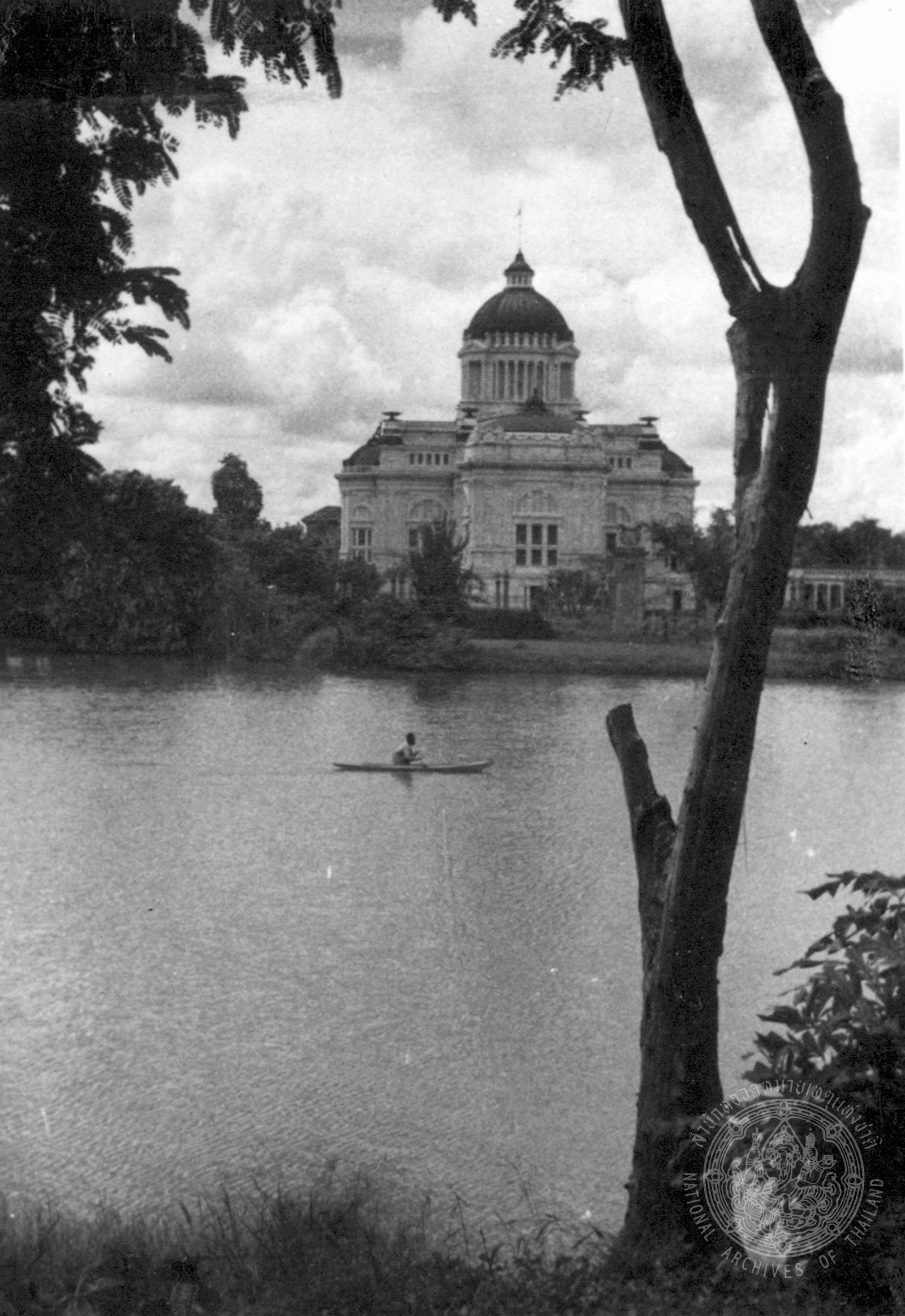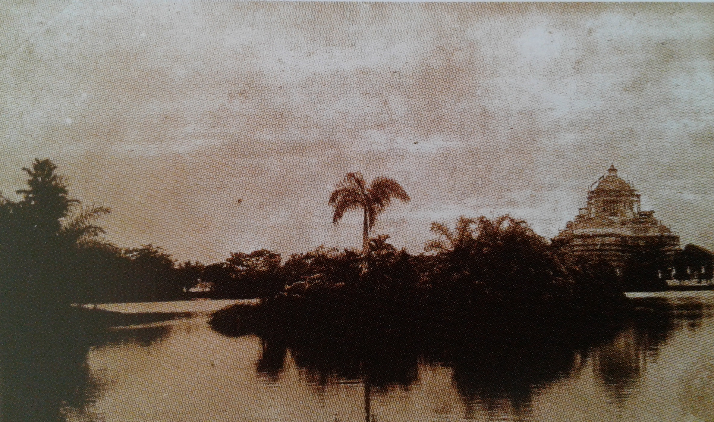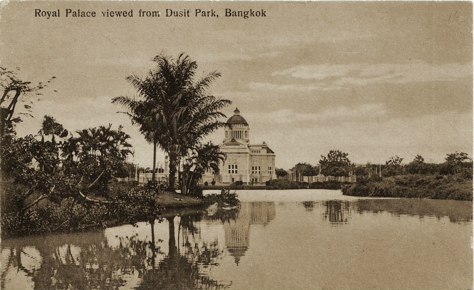 ภาพมุมกว้างที่ถ่ายจากสถานที่อันกลายมาสวนสัตว์ดุสิตในปัจจุบันที่เห็นภาพเกาะกลางน้ำกับพุ่มไม้ และฉากหลังไกลๆ ของพระที่นั่งอนันตสมาคม