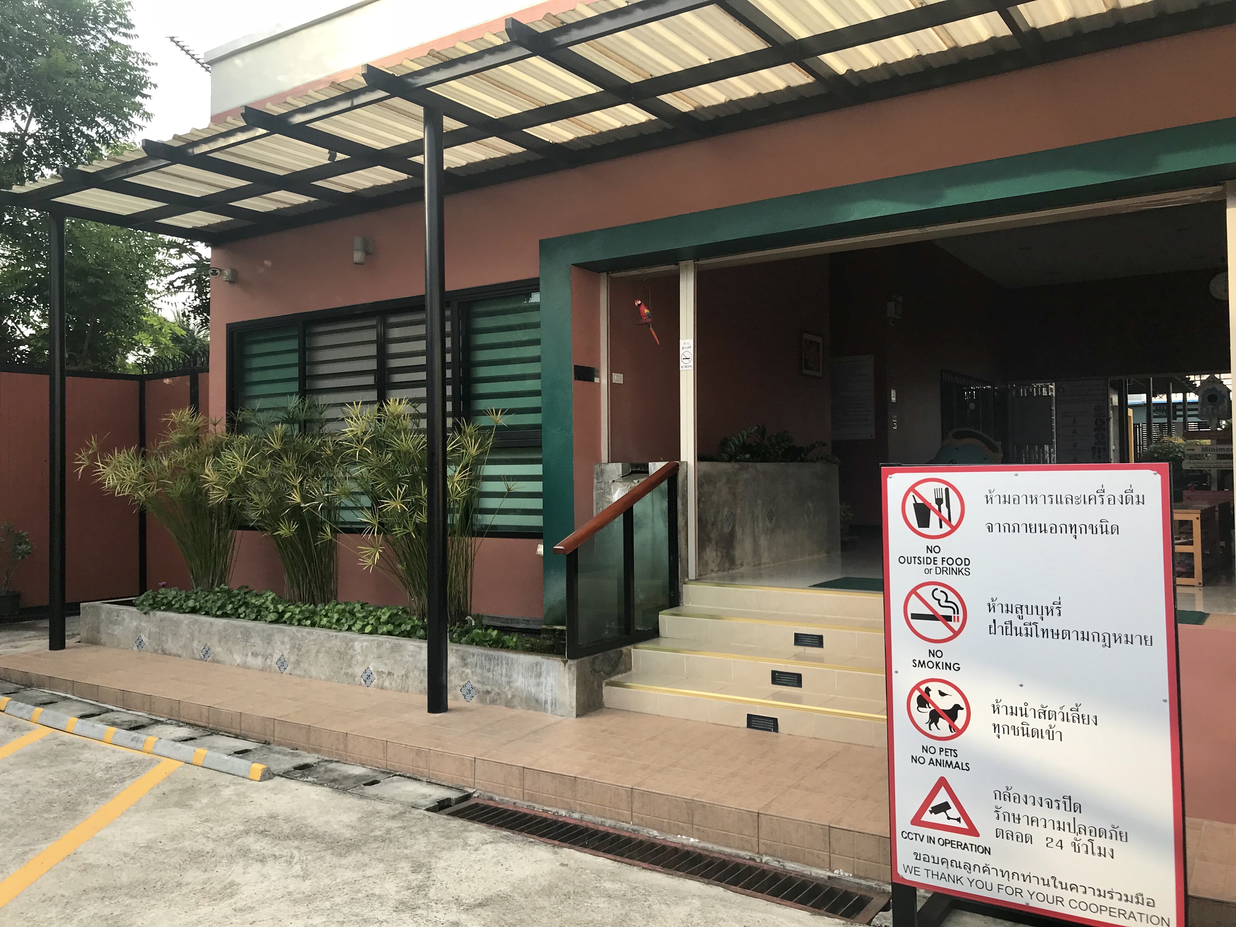 บริเวณทางเข้าด้านหน้า มีที่จอดรถกว้างขวางมาก มีร้านค้า ร้านอาหาร เครื่องดื่ม ไว้บริการลูกค้า แยกมุมไว้เสร็จสรรพ ไม่ให้เอาไปรับประทานในบริเวณสระว่ายน้ำ