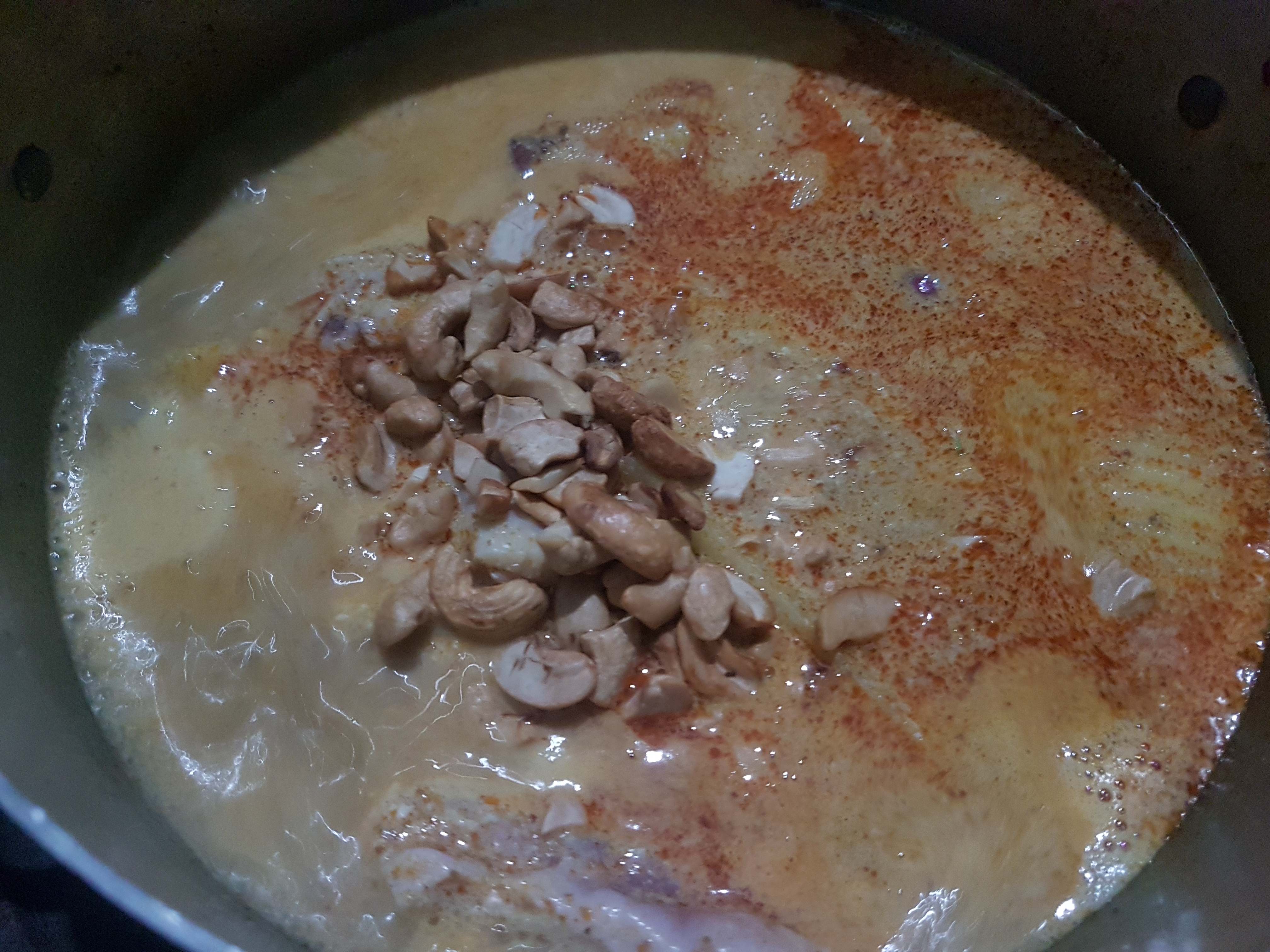 นำหม้อตั้งบนเตาไฟ เติมหัวกะทิลงไป คนด้วยทัพพีเคี่ยวให้แตกมัน จากนั้นใส่พริกเครื่องแกงลงไป ใช้ทัพพีคนเครื่องแกงให้เข้ากับน้ำกะทิ รอจนน้ำแกงเดือด อีกครั้ง เติมเนื้อไก่ลงไปคลุกเคล้าจนเข้าเนื้อ จากนั้นใส่มันฝรั่งลงไป ใส่เม็ดมะม่วงหิมพานต์ ปรุงรสด้วย น้ำมะขามเปียก น้ำตาลมะพร้าว เกลือผงปรุงรส น้ำปลา จากนั้น คนให้เข้ากัน ใช้ไฟกลาง เคี่ยวจน ไก่และหัวมันฝรั่งสุก จากนั้นชิมรสชาติตามที่ต้องการ เสร็จเรียบร้อยปิดเตา ตักใส่ถ้วยพร้อมเสิร์ฟเป็นอันเสร็จเรียบร้อยค่ะ