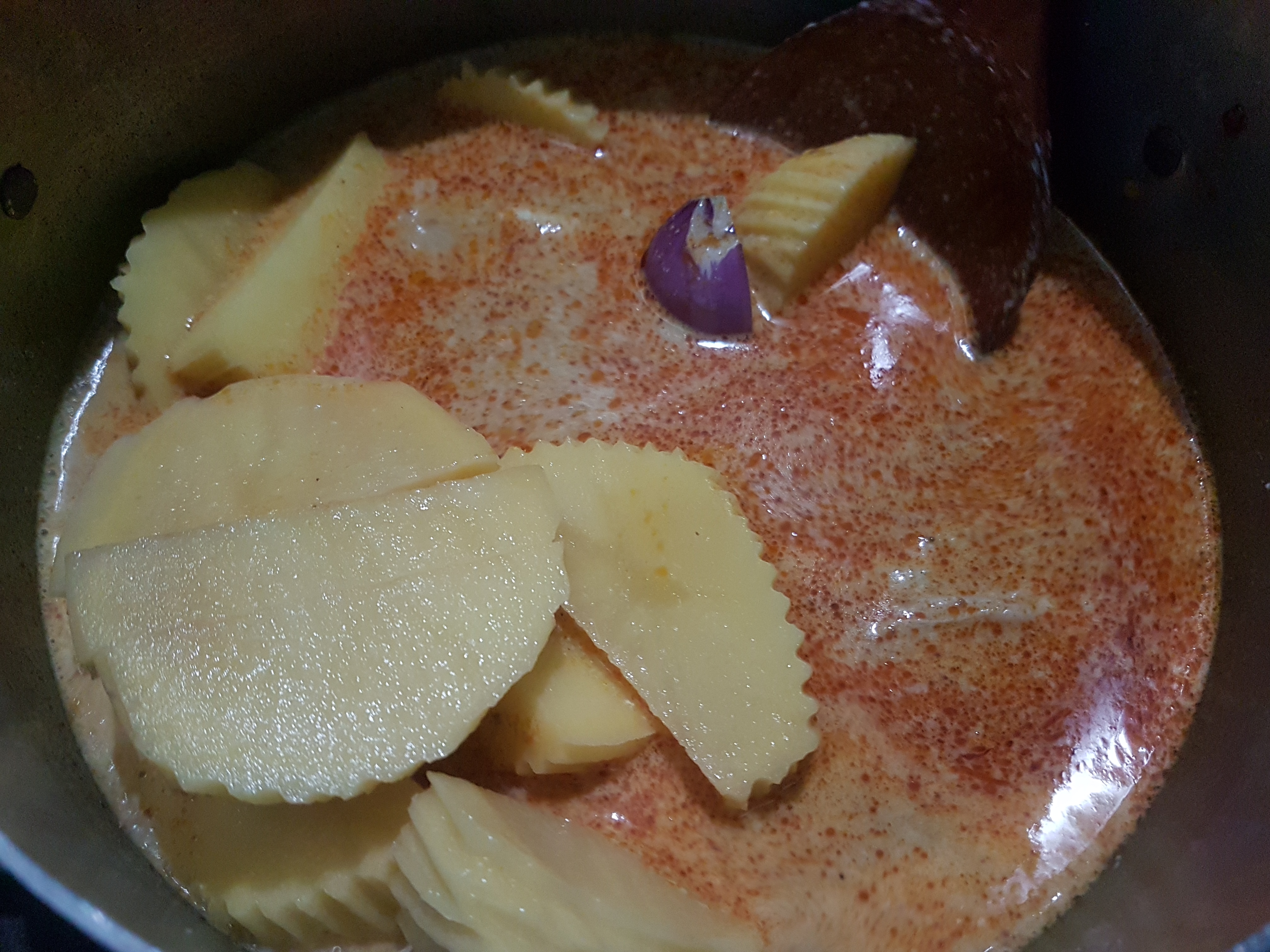 นำมันฝรั่งมาแล้วหน้าไม่สะอาดแล้วปอกเปลือกจากนั้นล้างด้วยน้ำสะอาดอีกครั้ง แล้วนำมาหั่นเป็นชิ้น วางใส่จานพักไว้ นำหอมแดงมาปอกเปลือกแล้วนำมาหั่น วางใส่จานพักไว้
