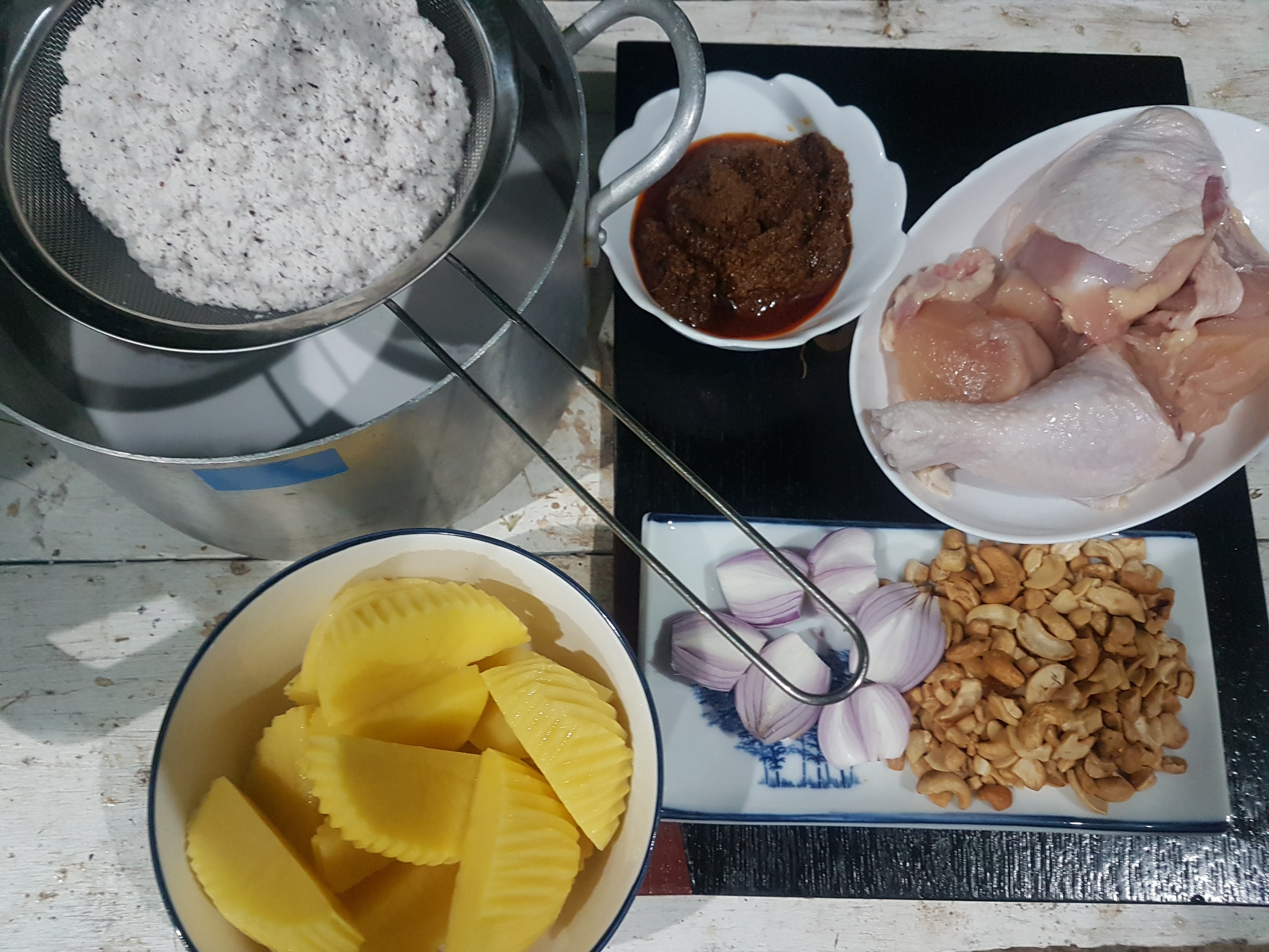 เพื่อความง่ายและสะดวกฉันซื้อเครื่องแกงมัสมั่นมาจากตลาด มะพร้าวที่บ้าน เริ่มจากฉันปอกมะพร้าว จากนั้นก็ขูดมะพร้าว แล้วนำมาคั้นหัวกะทิ