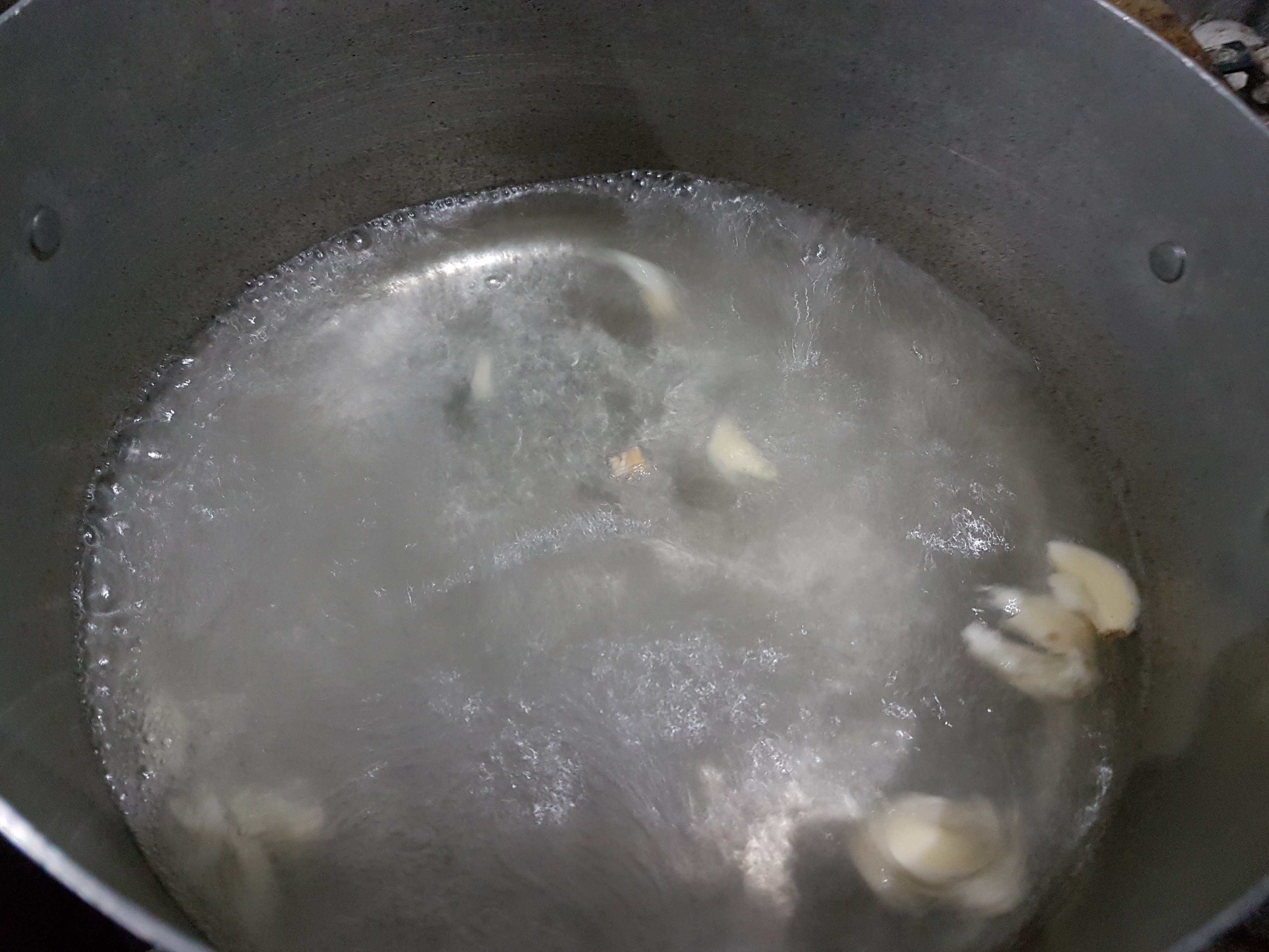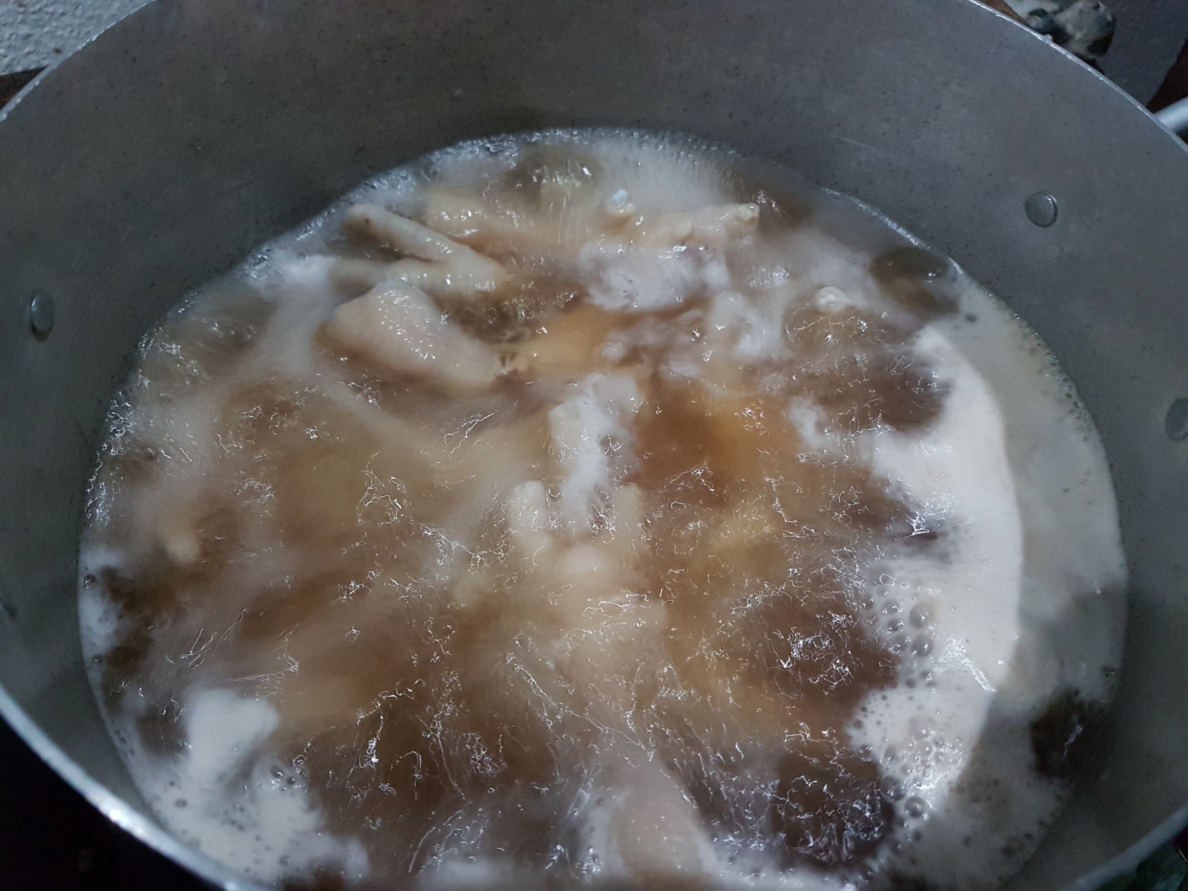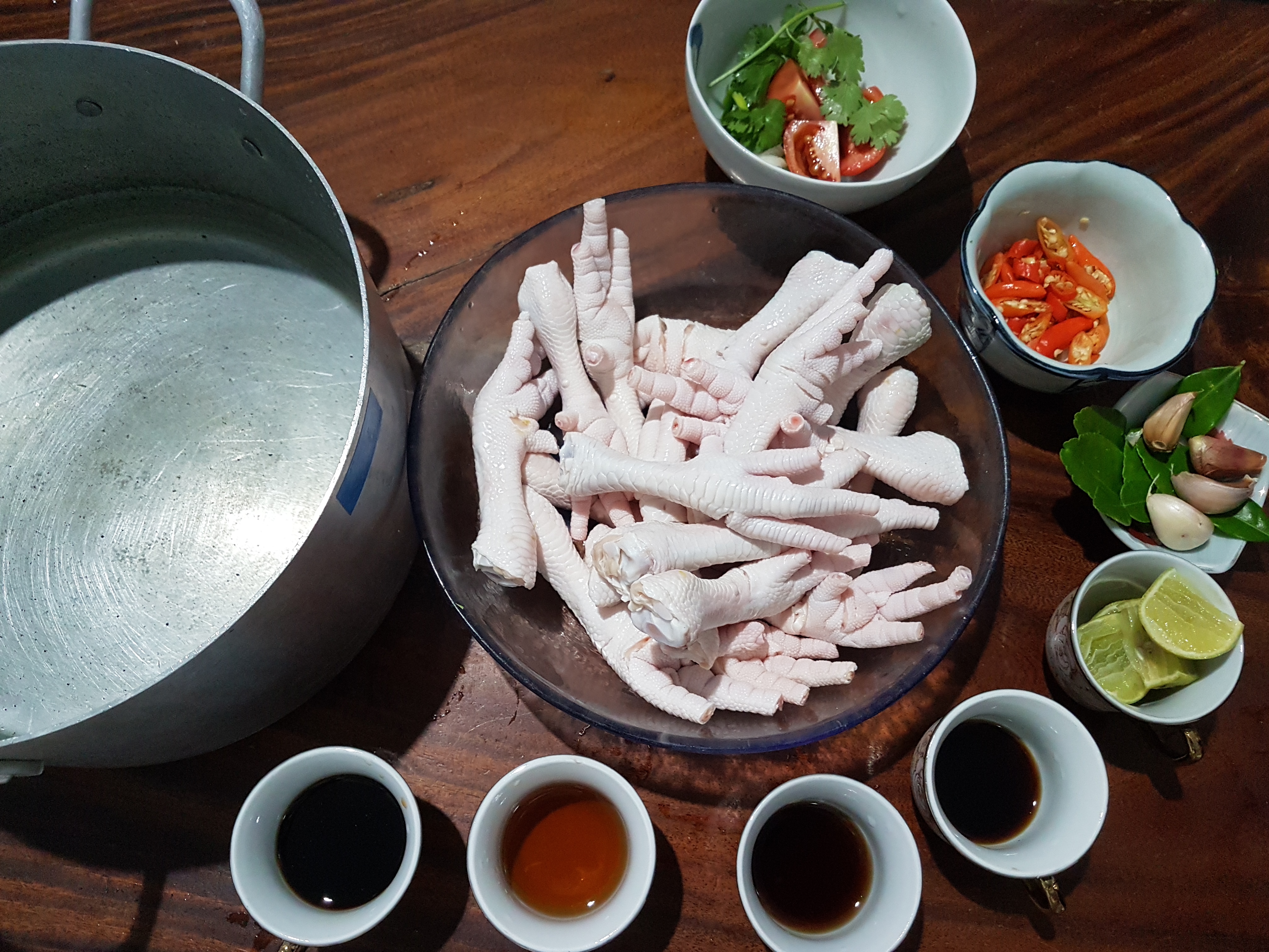 น้ำหม้อตั้งบนเตาไฟ ใช้ไฟปานกลาง จากนั้นเติมน้ำสะอาดลงไป รอจนน้ำเดือด ใส่กระเทียมลงไป ตามด้วยตีนไก่ ต้มตีนไก่จนเปลือย หนังหลุดออกจากกระดูก