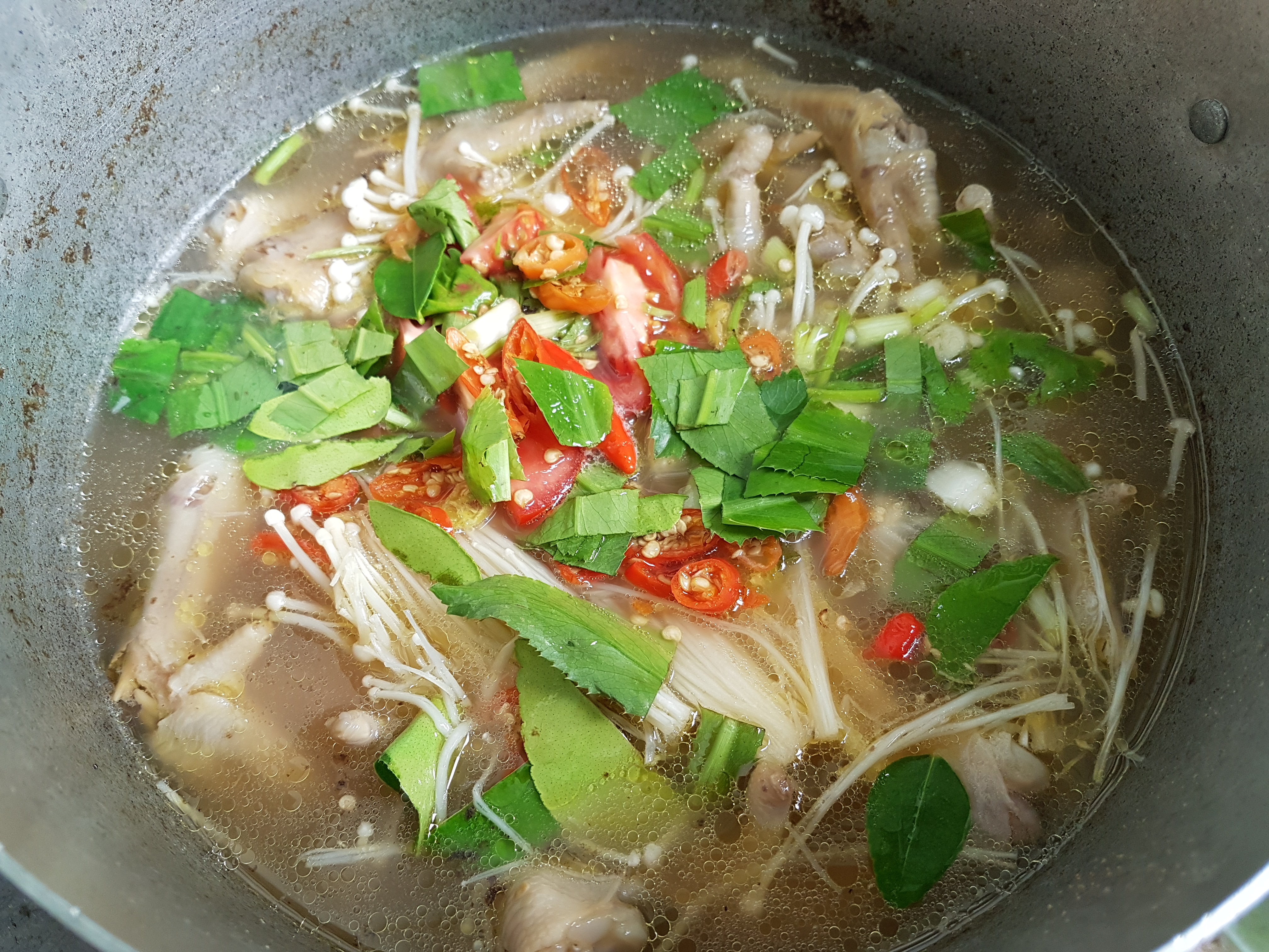 นำตีนไก่มาสับเล็บแล้วล้าง ด้วยน้ำสะอาด นักแสดงไว้ให้สะเด็ดน้ำจากนั้นนำข่าและตะไคร้ล้างน้ำให้สะอาดนำมาหั่นเป็นท่อน มะเขือเทศนำมาหั่นเป็นชิ้น เตรียมไว้ กระเทียมนำมาปอกเปลือกจากนั้นก็ล้างน้ำให้สะอาด ทุบให้แหลกเตรียมไว้ ส่วนผสมอื่นอื่นเตรียมตักตวงตามสูตร เตรียมไว้เลยค่ะ