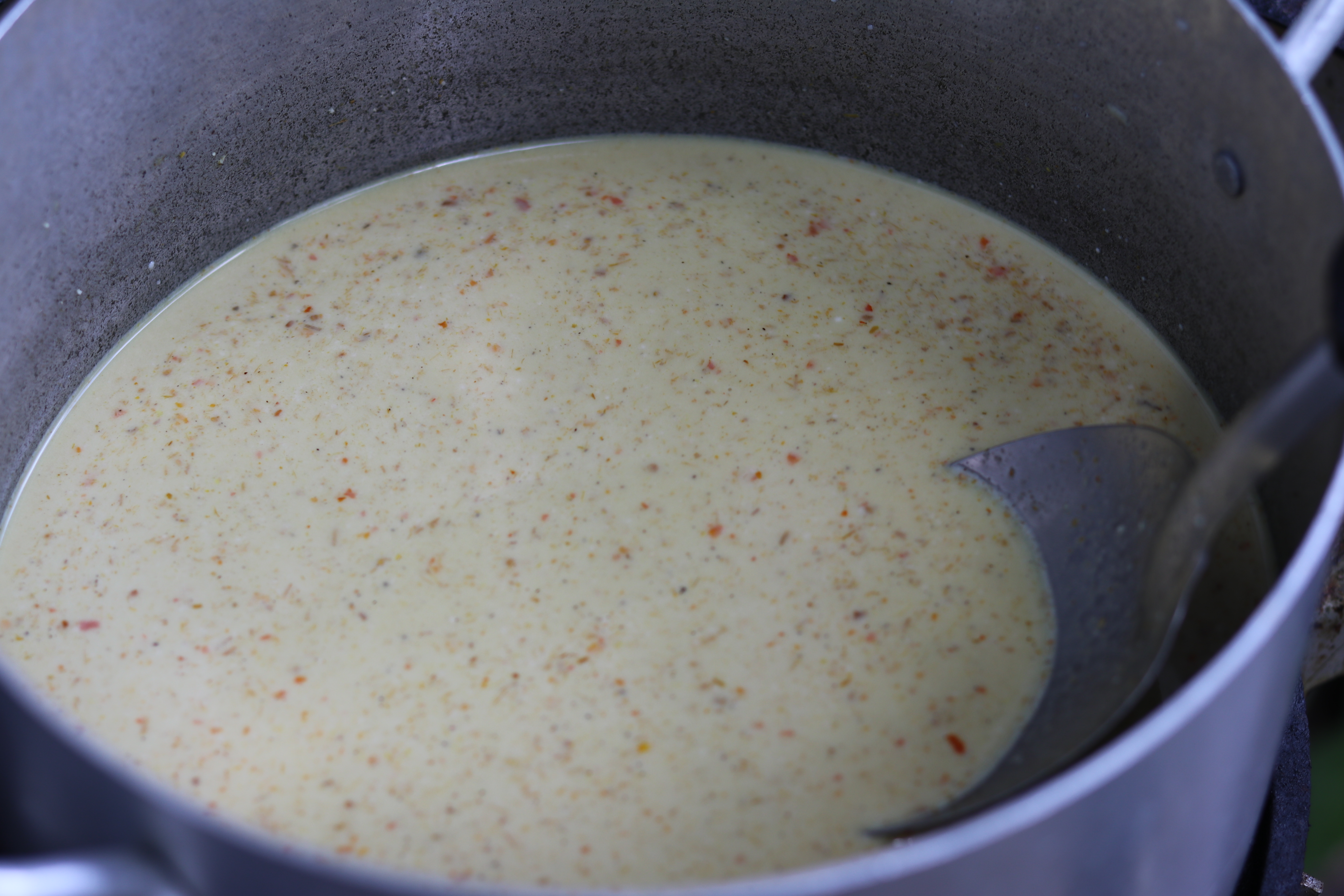 นำหม้อตั้งบนเตาไฟจากนั้นใช้ไฟกลาง เติมน้ำกะทิลงไป จากนั้นนำเครื่องแกงและกะปิใส่ลงไป ใช้ทัพพีคนเครื่องแกง และกะปิให้ละลายเข้ากันกับน้ำกะทิรอจนน้ำแกงเริ่มเดือด