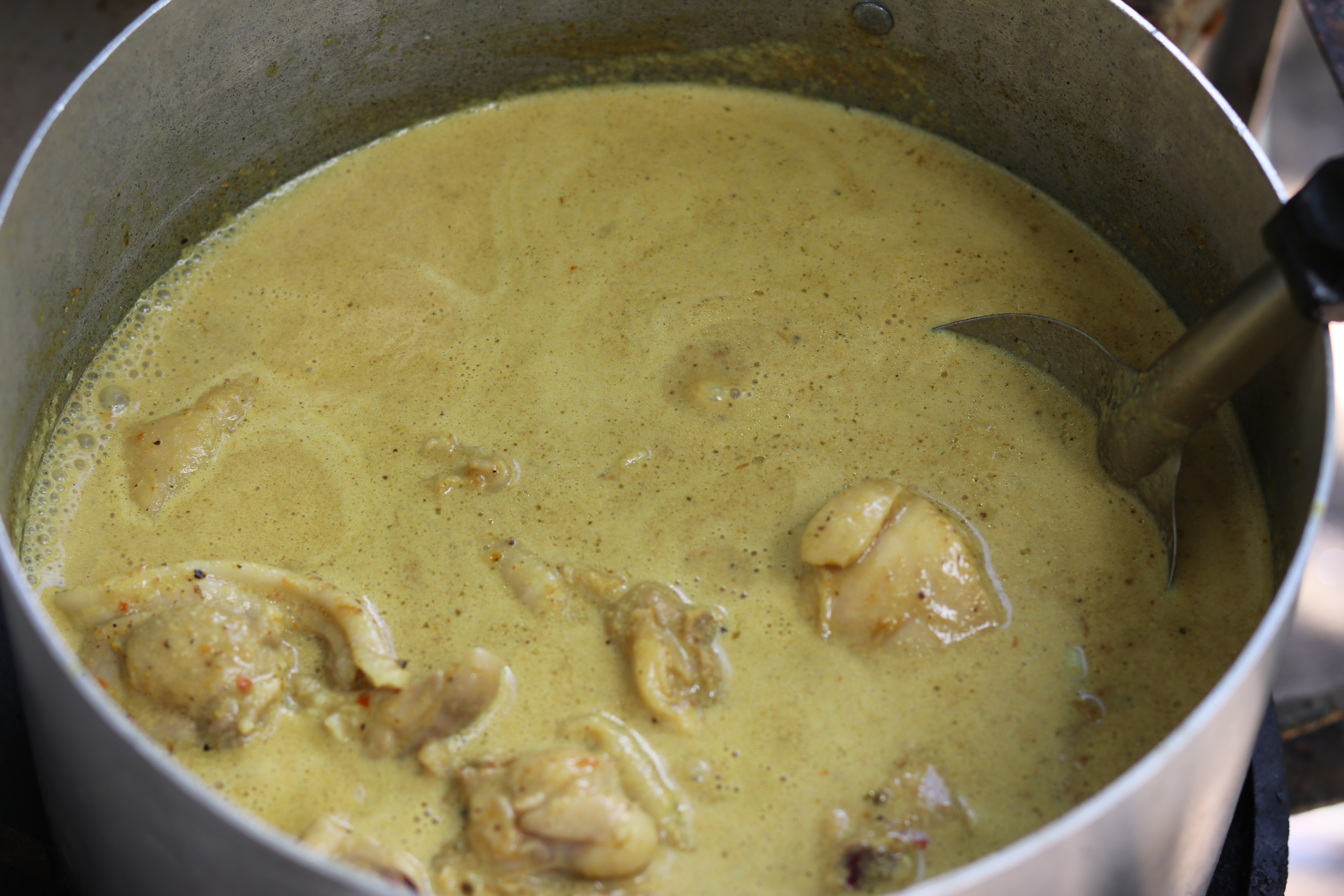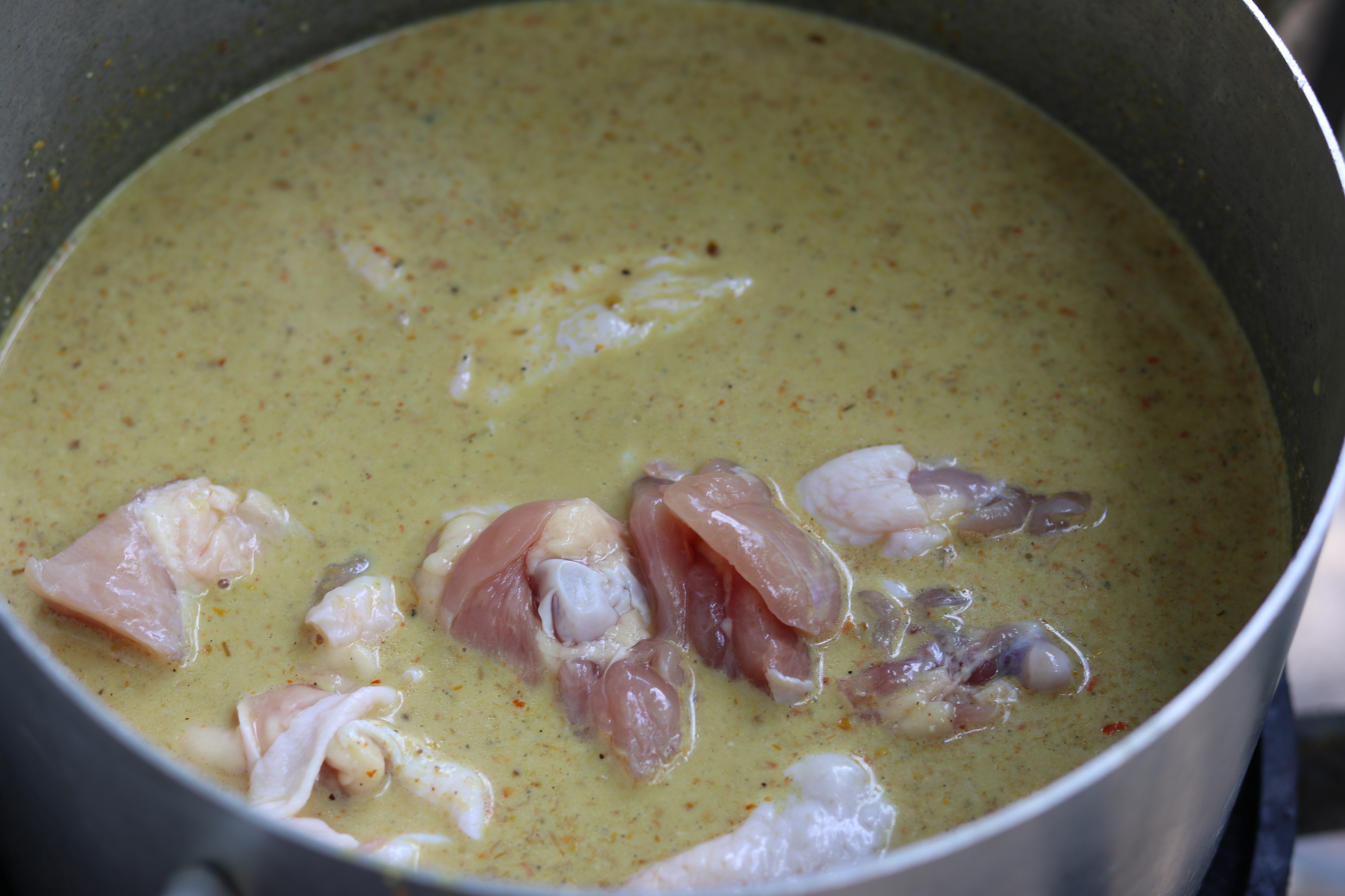 นำไก่ใส่ลงไป จากนั้นใช้ทัพพีกดไก่ให้จมกับน้ำแกงรอจนไกลเริ่มสุก จากนั้นก็ปรุงรสชาติด้วยน้ำปลา น้ำตาลมะพร้าว เกลือ ผงคนอร์ พริกไทยดำ