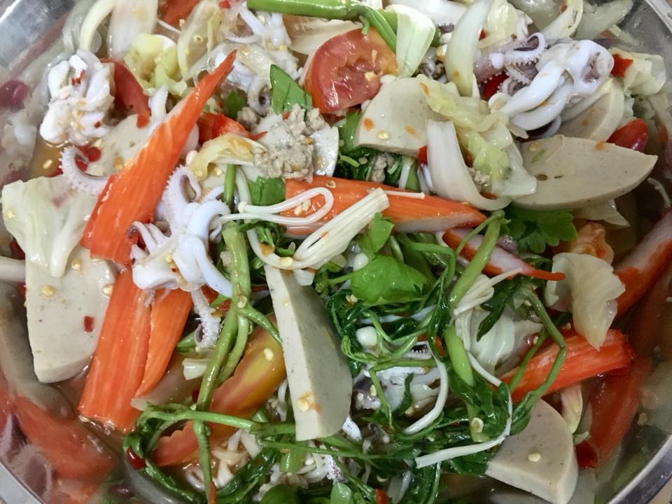 เครื่องปรุงไม่มีอะไรมาก ใส่วัตถุดิบที่เราต้องการ เช่น ปูอัด ปลาหมึก เห็ดเข็มทอง ผักกะเฉด หมูสับ