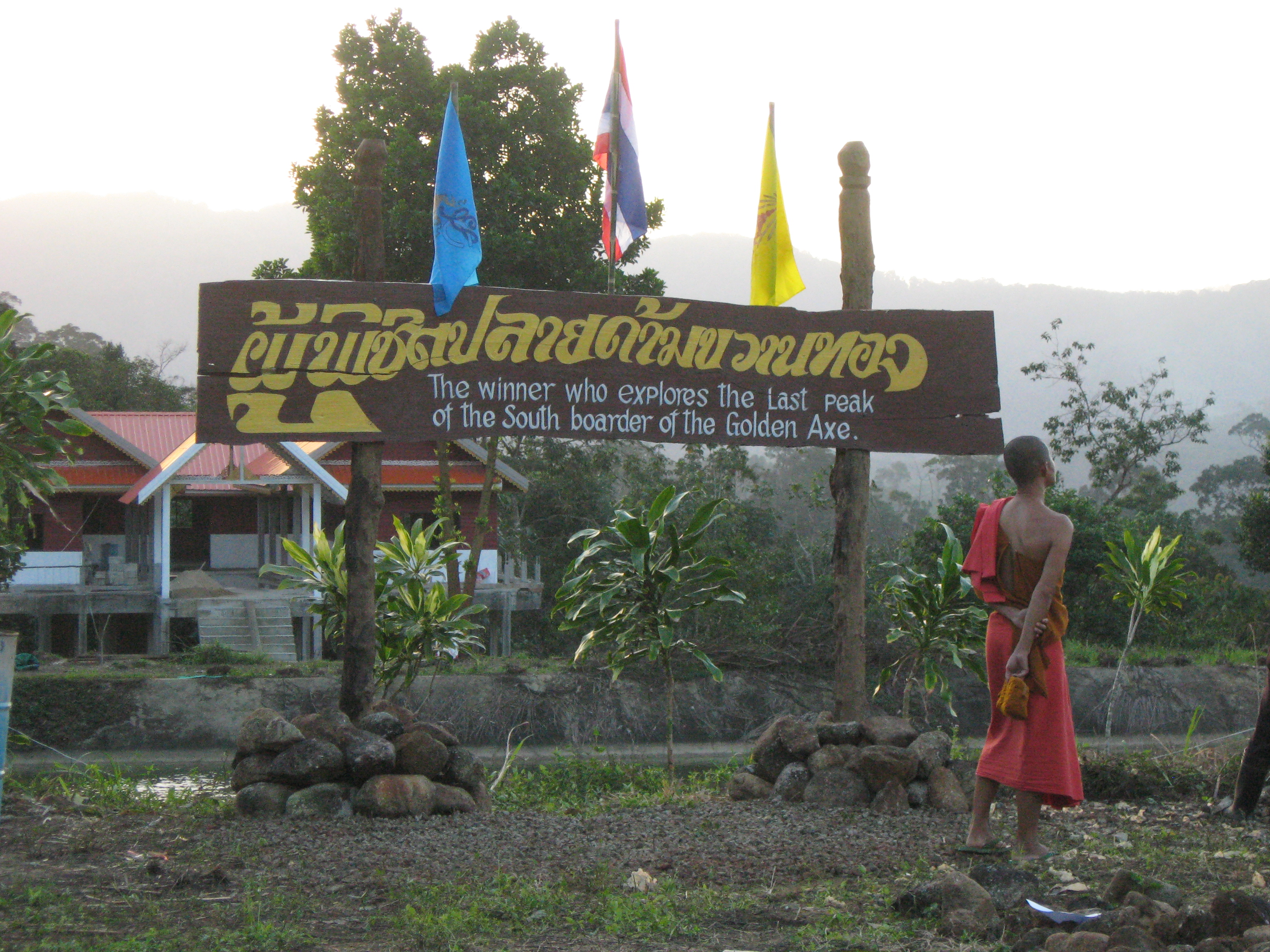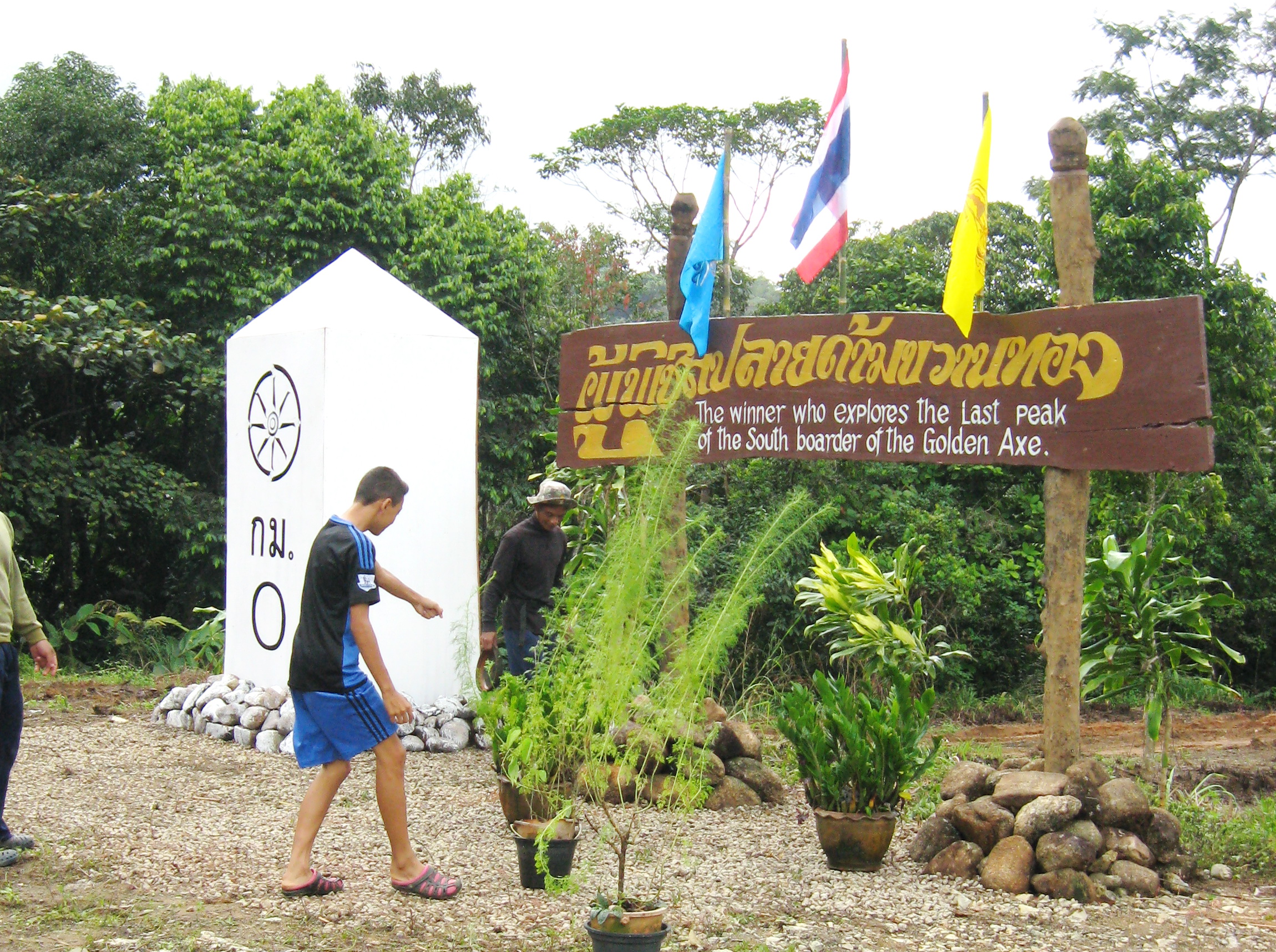 นี้ครับไอเดียพระอาจารย์ผม ท่านให้เขียนว่า"ผู้พิชิตปลายด้ามขวานทอง" ท่านบอกว่าเขียนอย่างนี้เดียวจะมีคนมาถ่ายรูปคู่กับป้ายเองแหละ