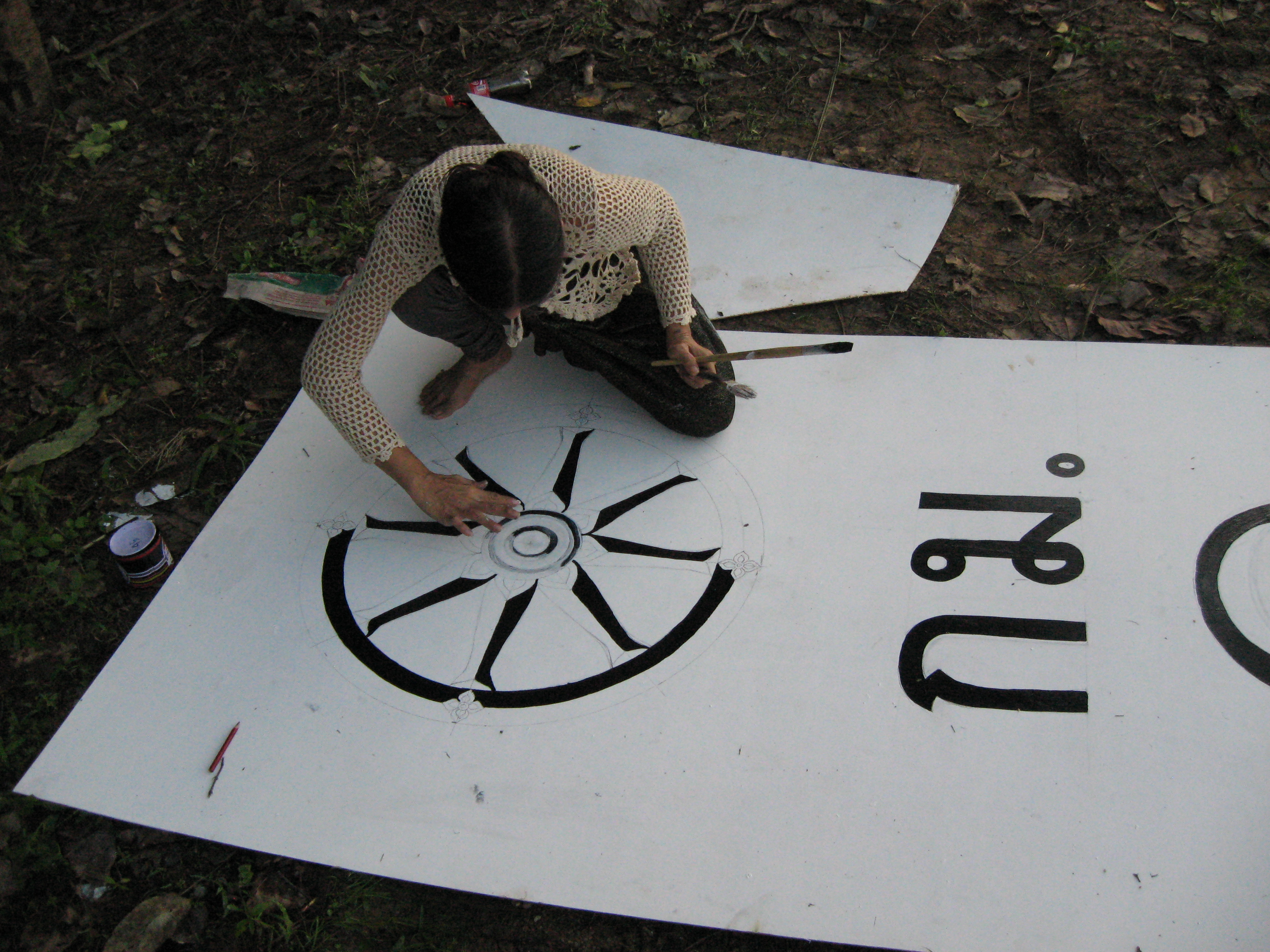 คุณแม่กำลังเขียนพระธรรมจักรครับ พระอาจารอย่ากได้หลักกิโลเมตรอันใหญ่ๆเขียนว่า ก.ม.0 แล้วข้างบนเป็นตราพระธรรมจักร