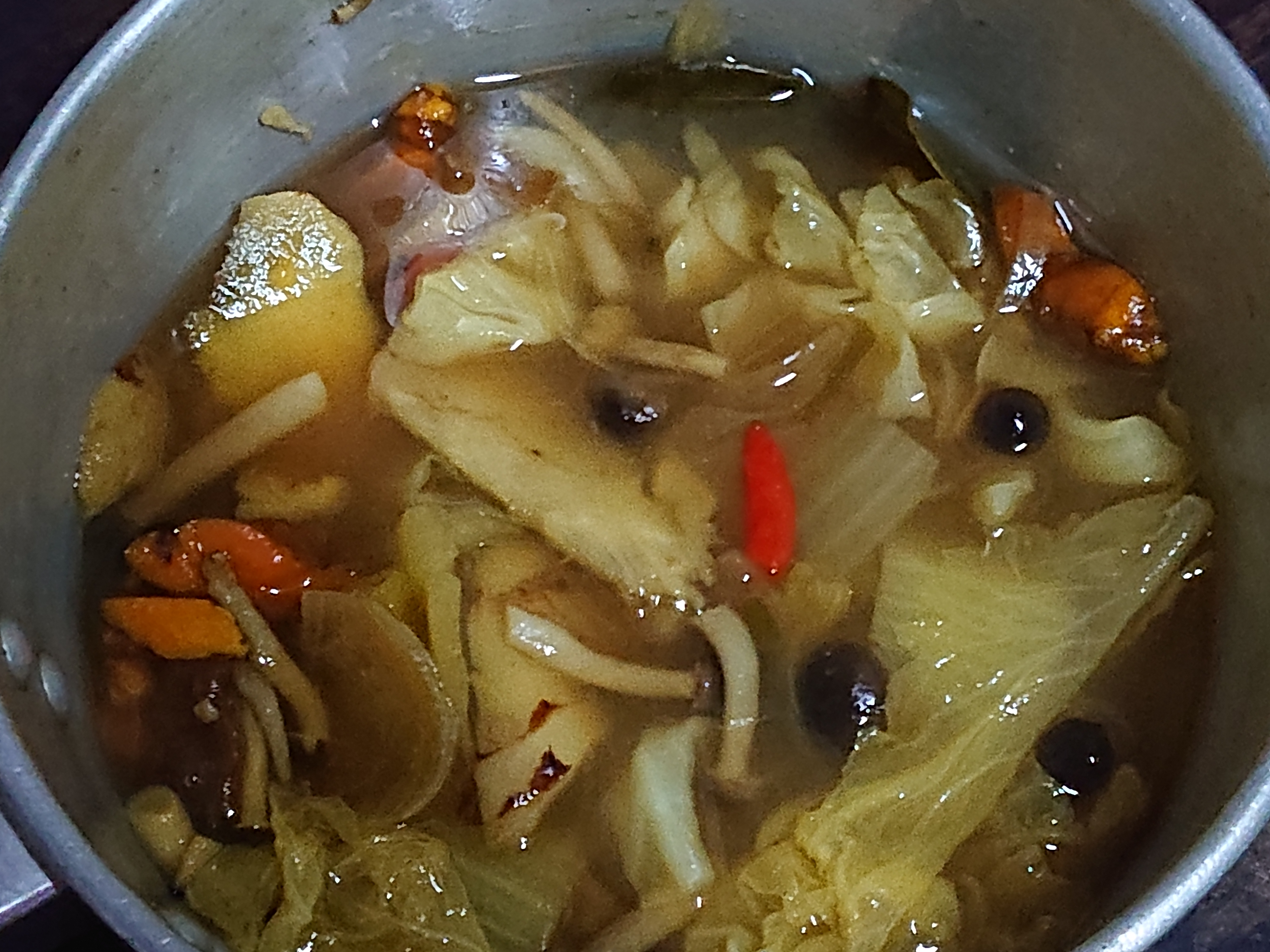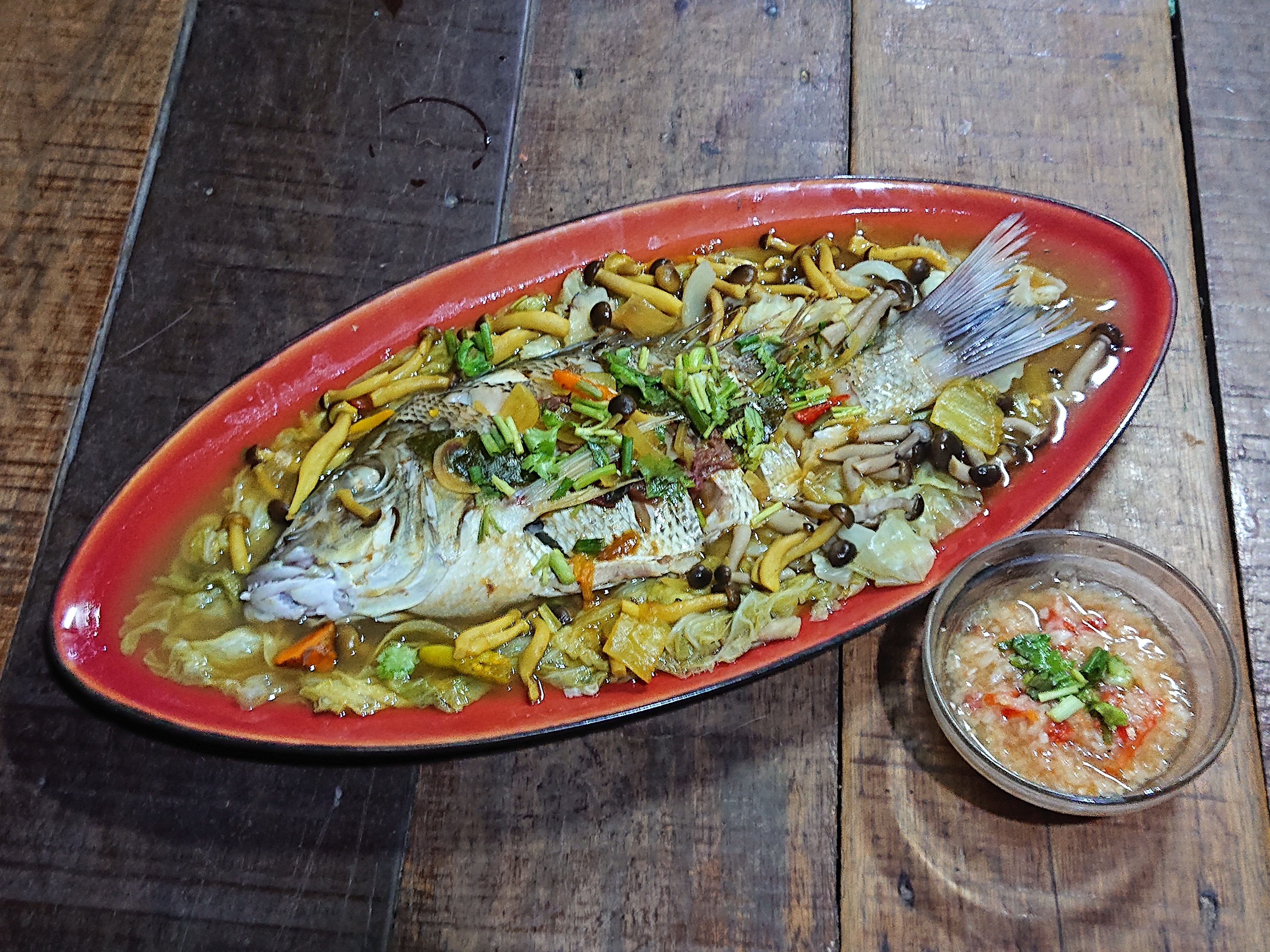 มาทำน้ำซุปกันครับ ขมิ้น ข่า ใบมะกรูด เกลือ น้ำมะขามเปียก พริกขี้หนู เห็ด หอมแดง ต้มเข้าด้วยกัน ใส่พริก มะนาว ปรุงรสตามชอบแล้วเอาไปราดบนปลา แกล้มด้วยน้ำจิ้มซีฟู้ด แซ่บไปเลยคร้าบ