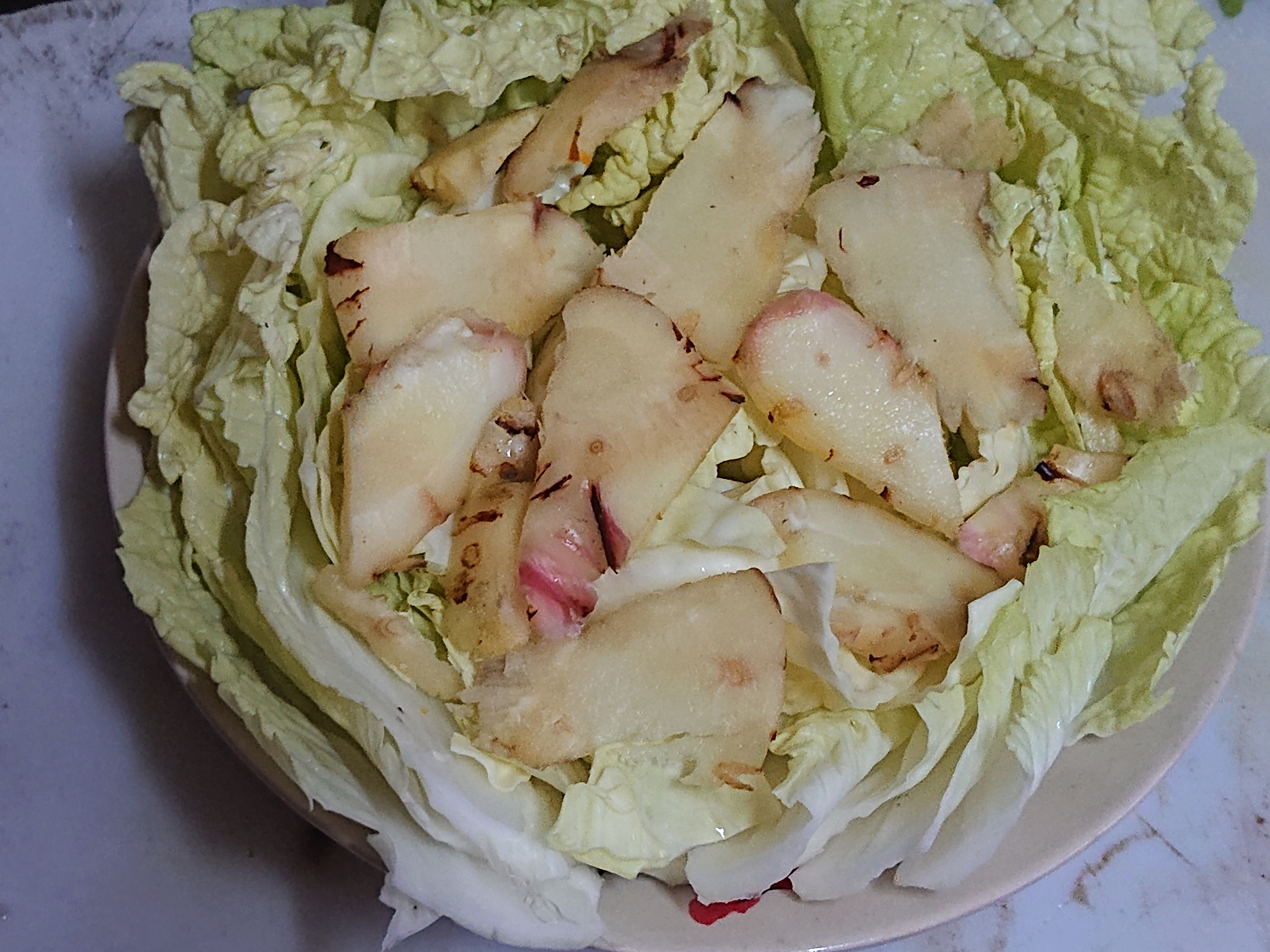จัดจานนึ้งใส่ผักกาดขาว กะหลั่มปลี ข่า แล้วก็เอาปลาวางทับลงไป