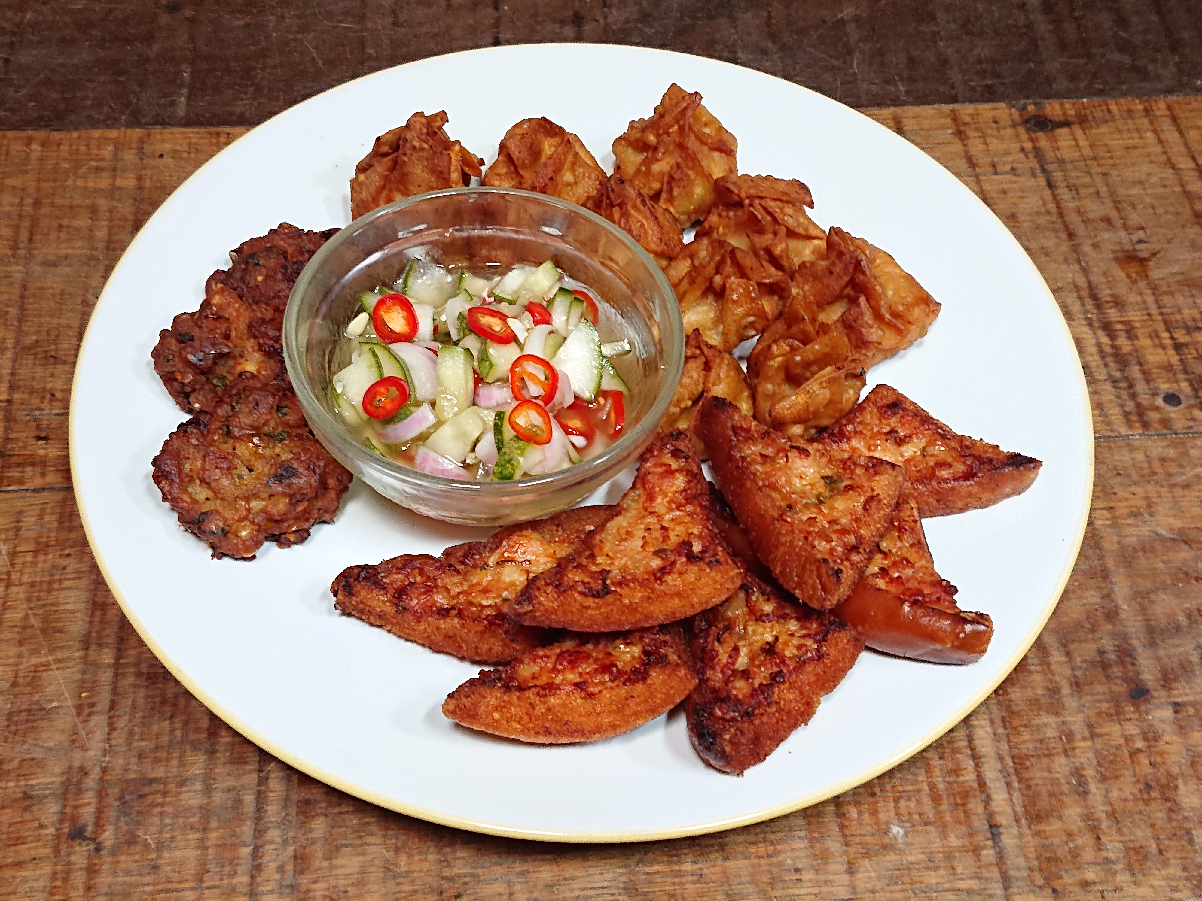 อาหารว่างยามบ่าย ขนมปังหน้าหมูเกี้ยวทอดน้ำจิ้มอาจาด