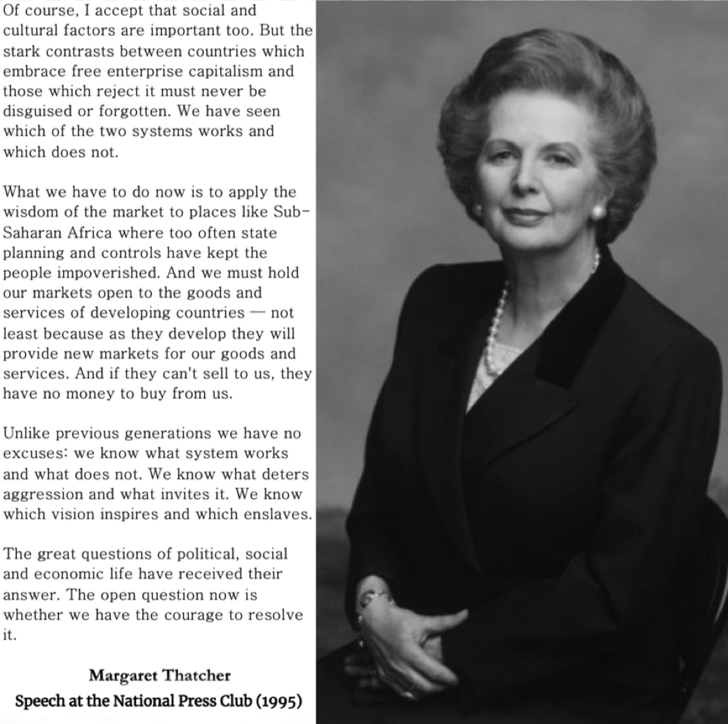 Of course, I accept that social and cultural factors are important too. But the stark contrasts between countries which embrace free enterprise capitalism and those which reject it must never be disguised or forgotten. We have seen which of the two systems works and which does not.