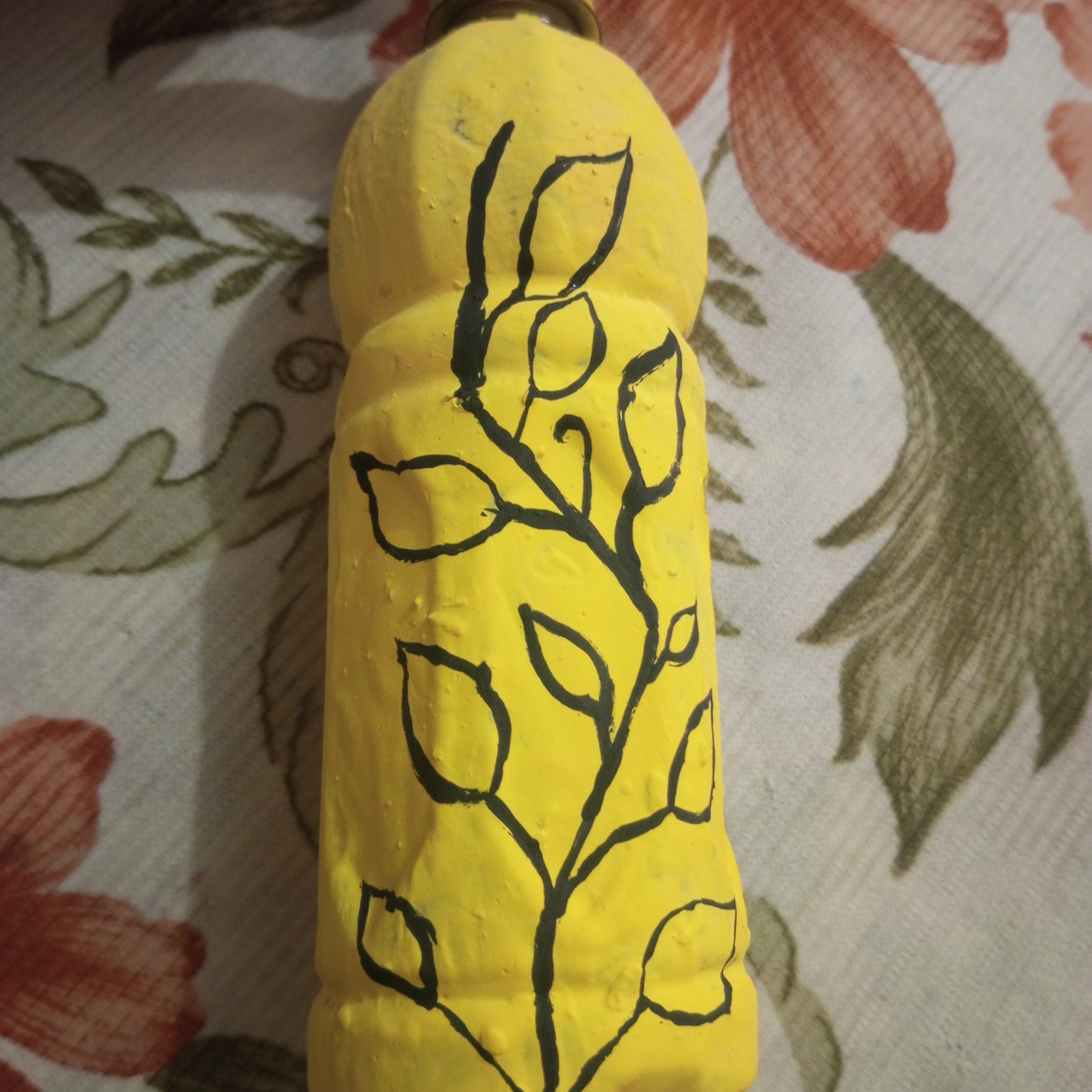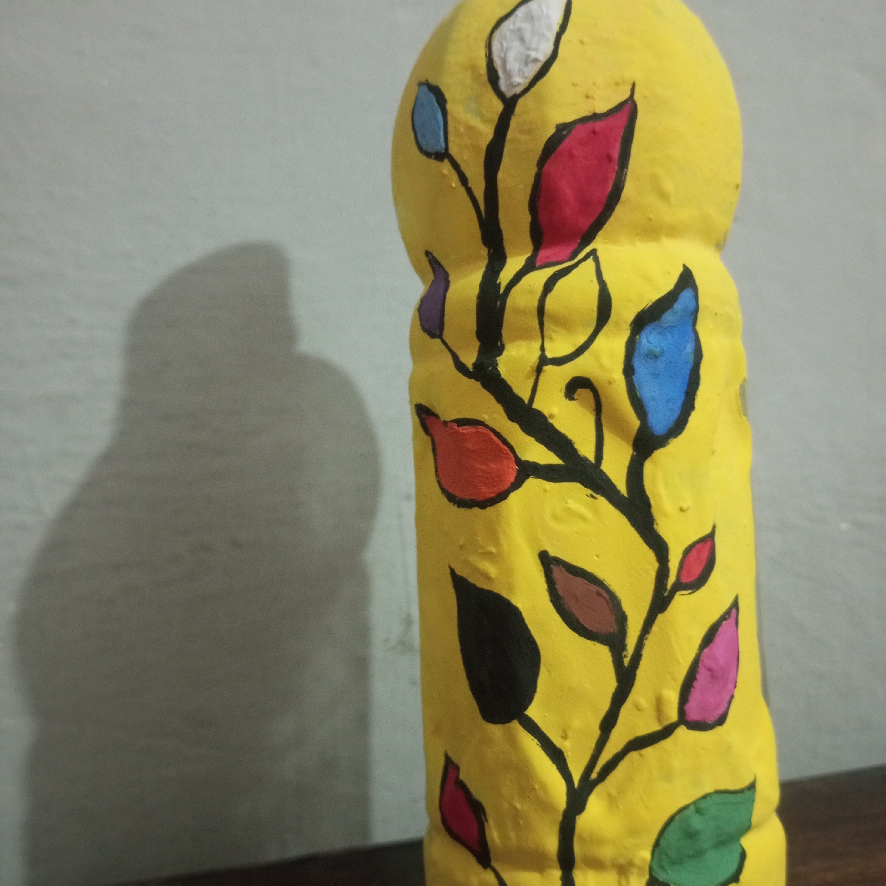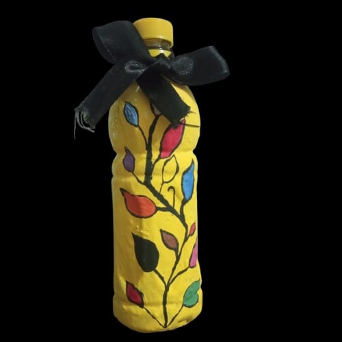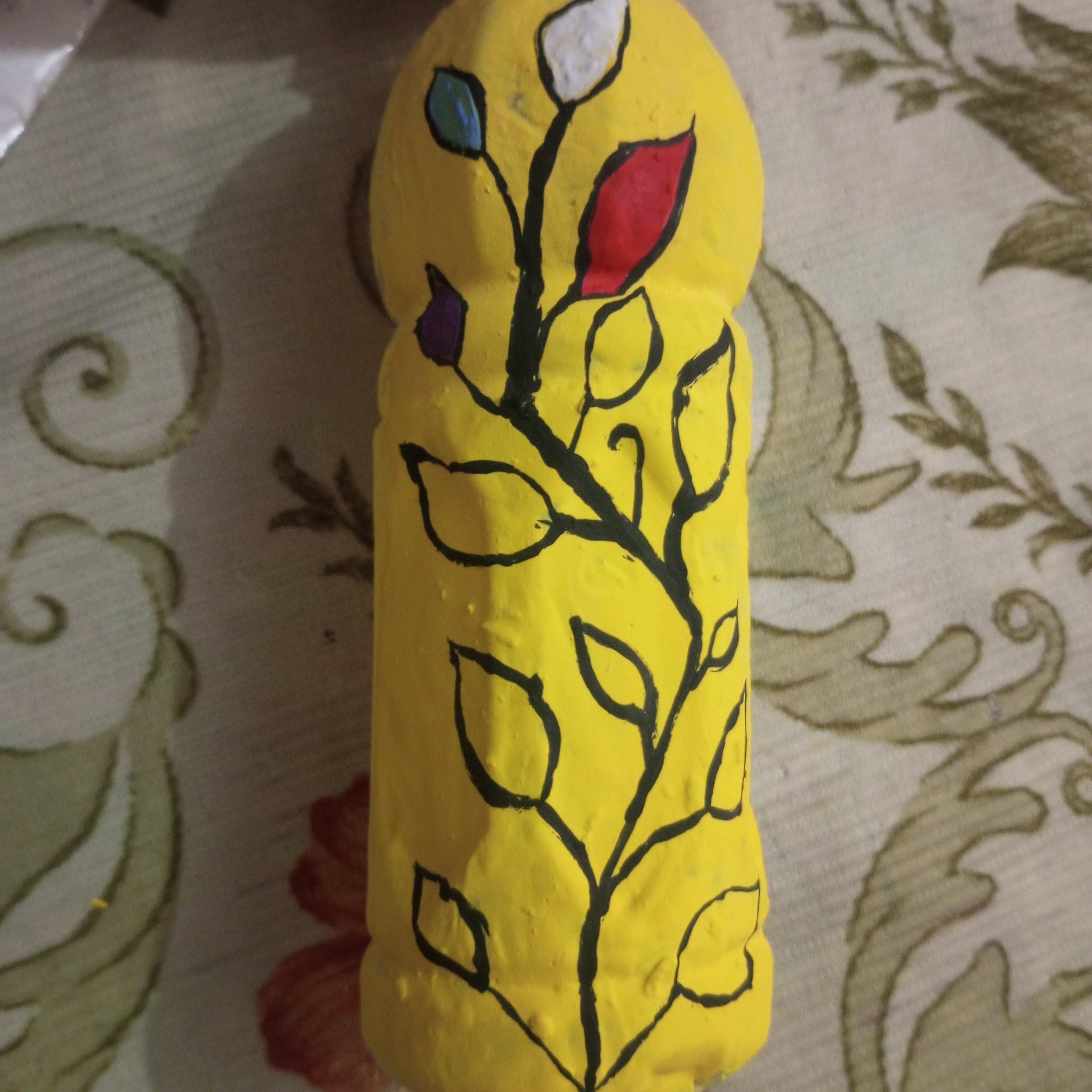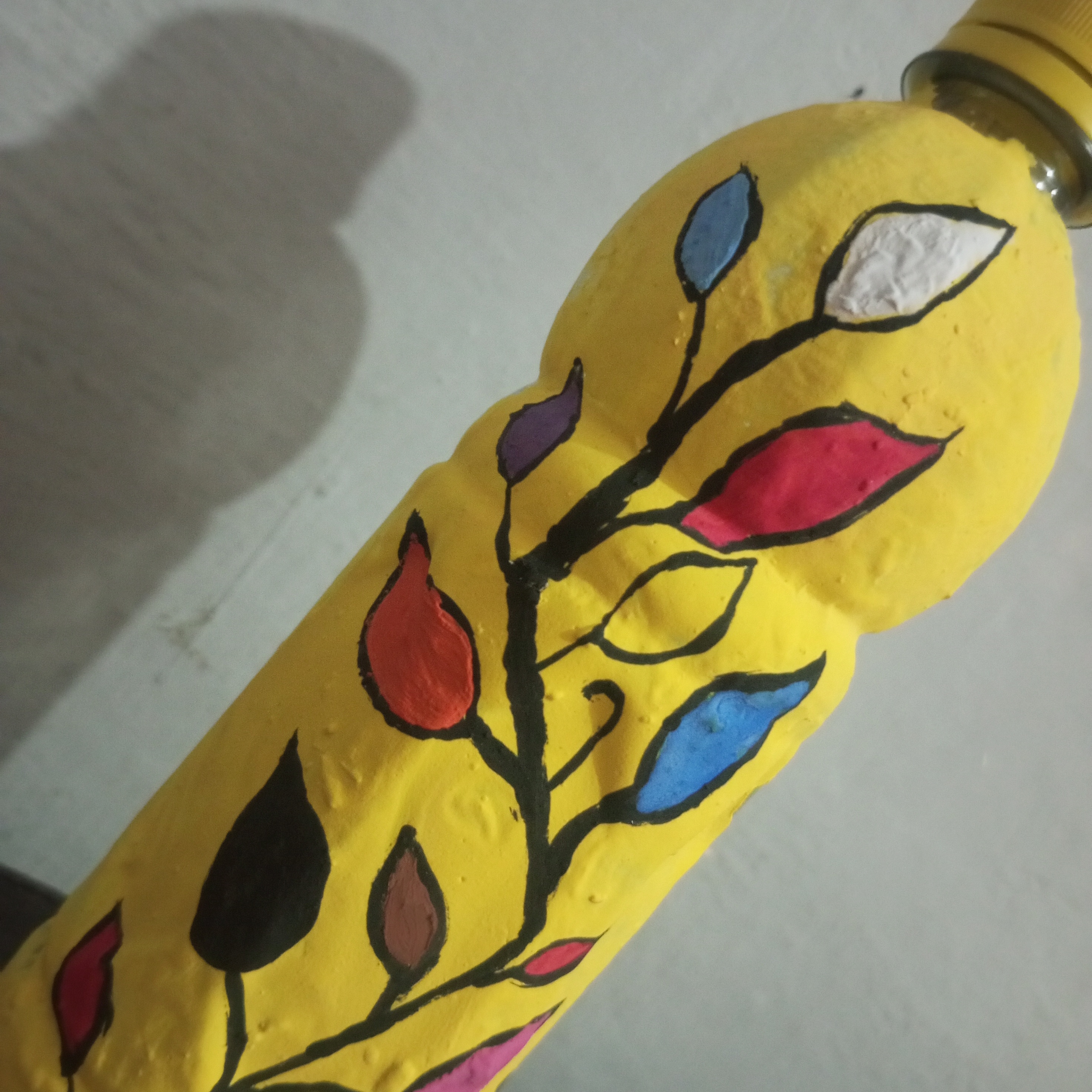No I did not face any great difficulty during this painting. Although painting on a plastic bottle was a new experience for me. I managed to complete it easily. I worked carefully step by step and completed each step with patience. Everything went smoothly from the yellow base to the different colors of the branch, leaves and finally the leaves. With focus and hard work. I am able to complete the painting successfully. Overall it was a pleasant and creative experience.