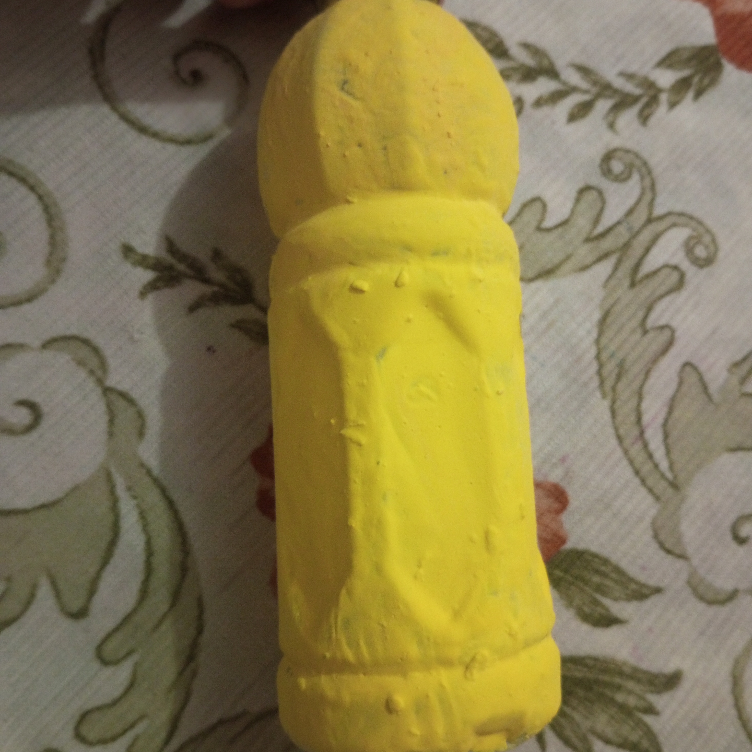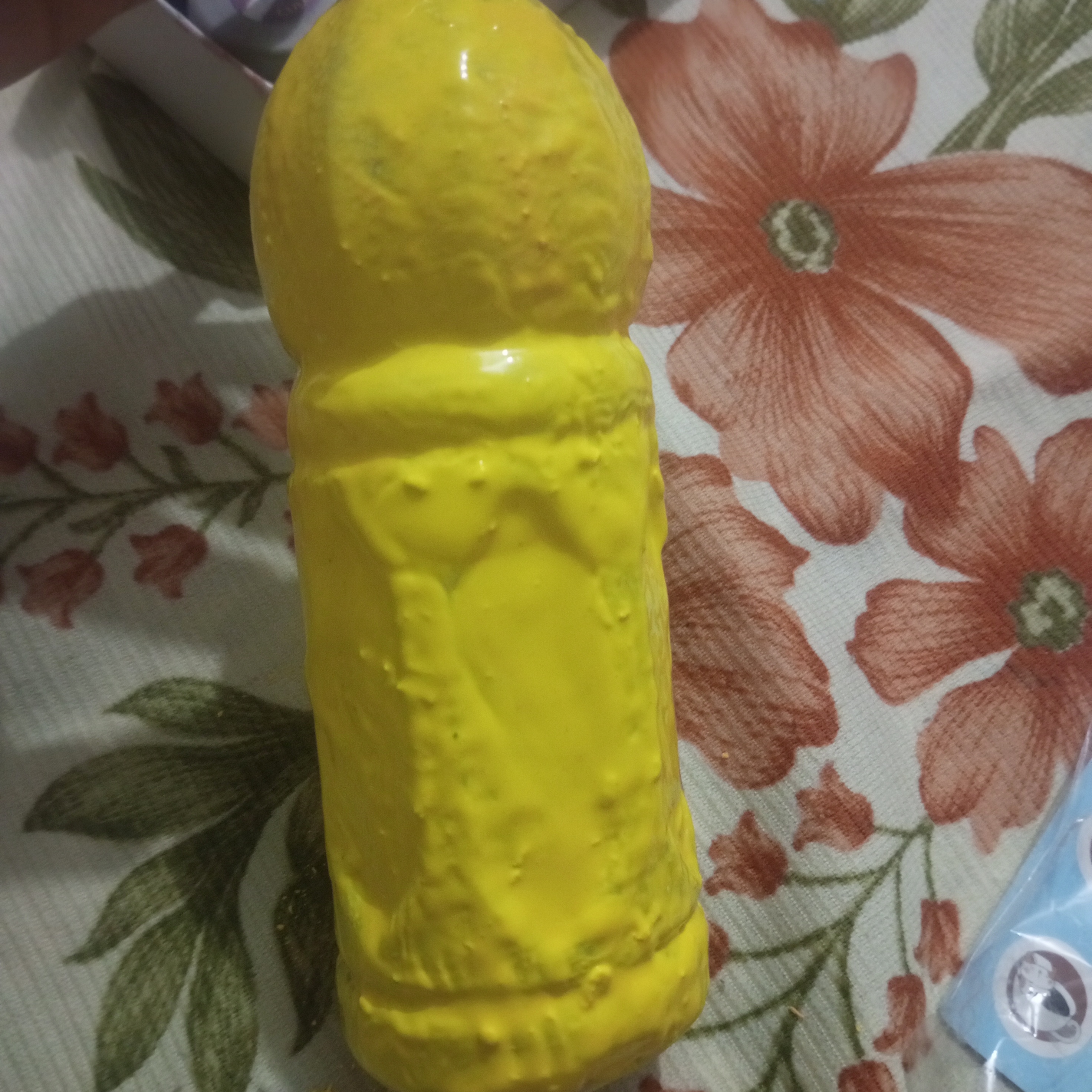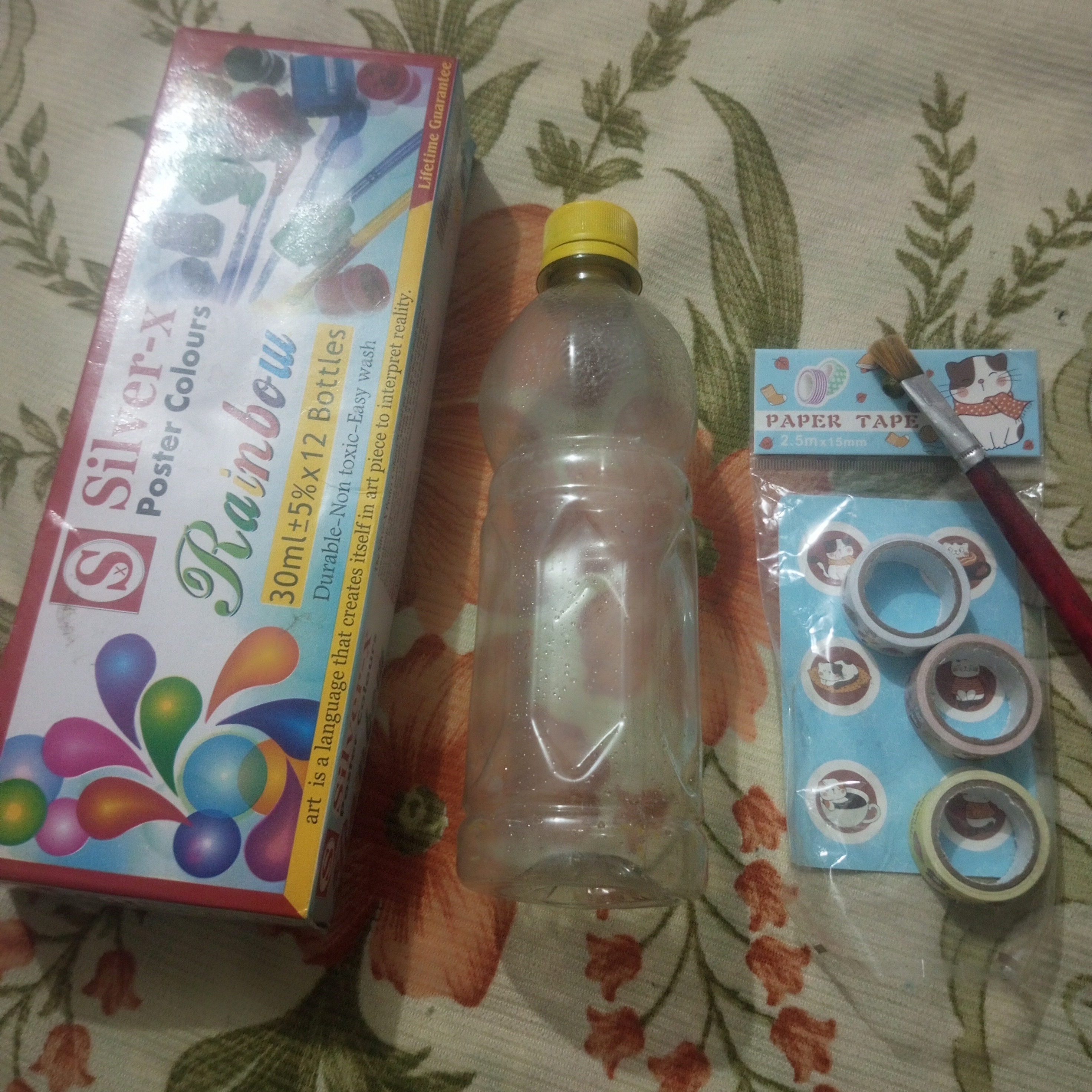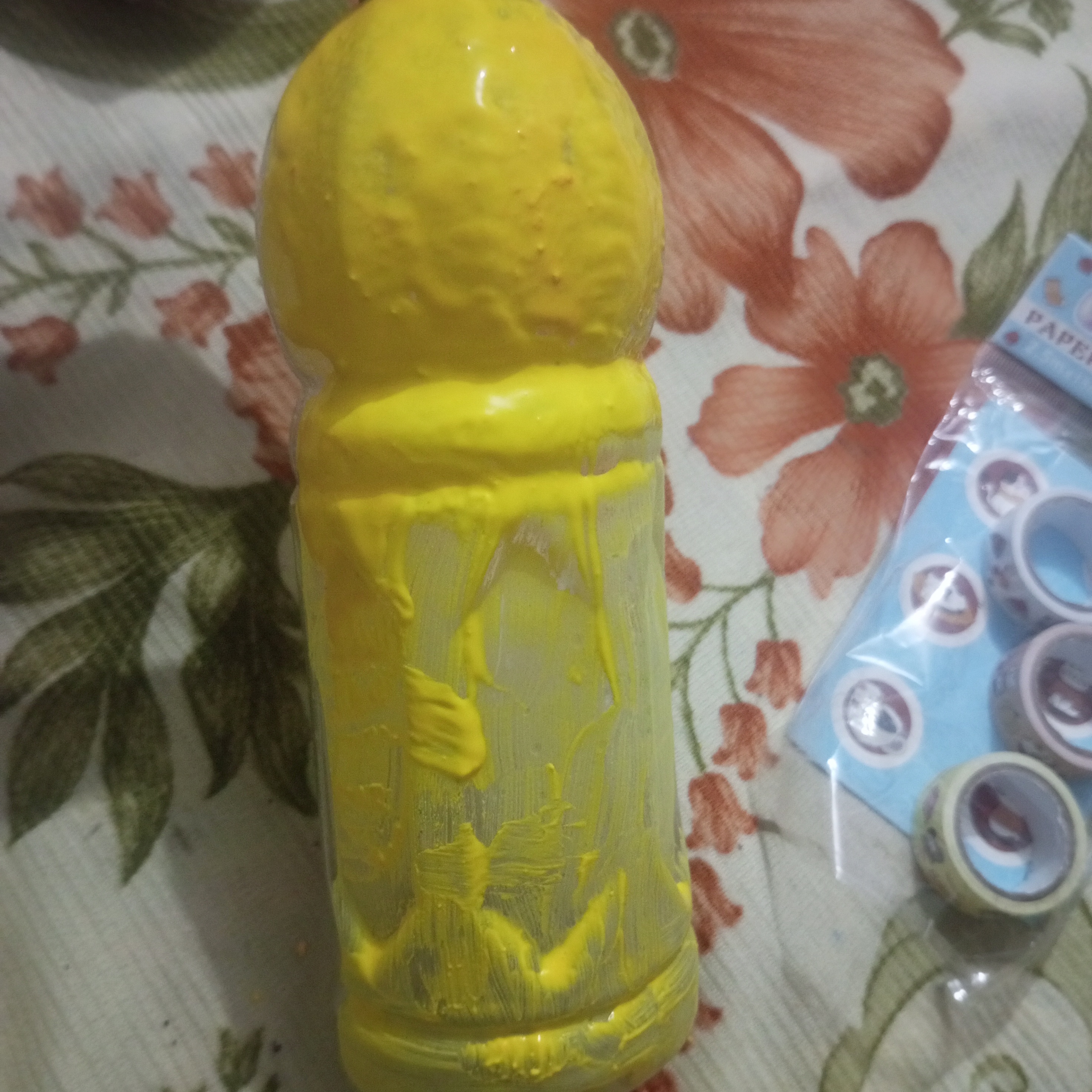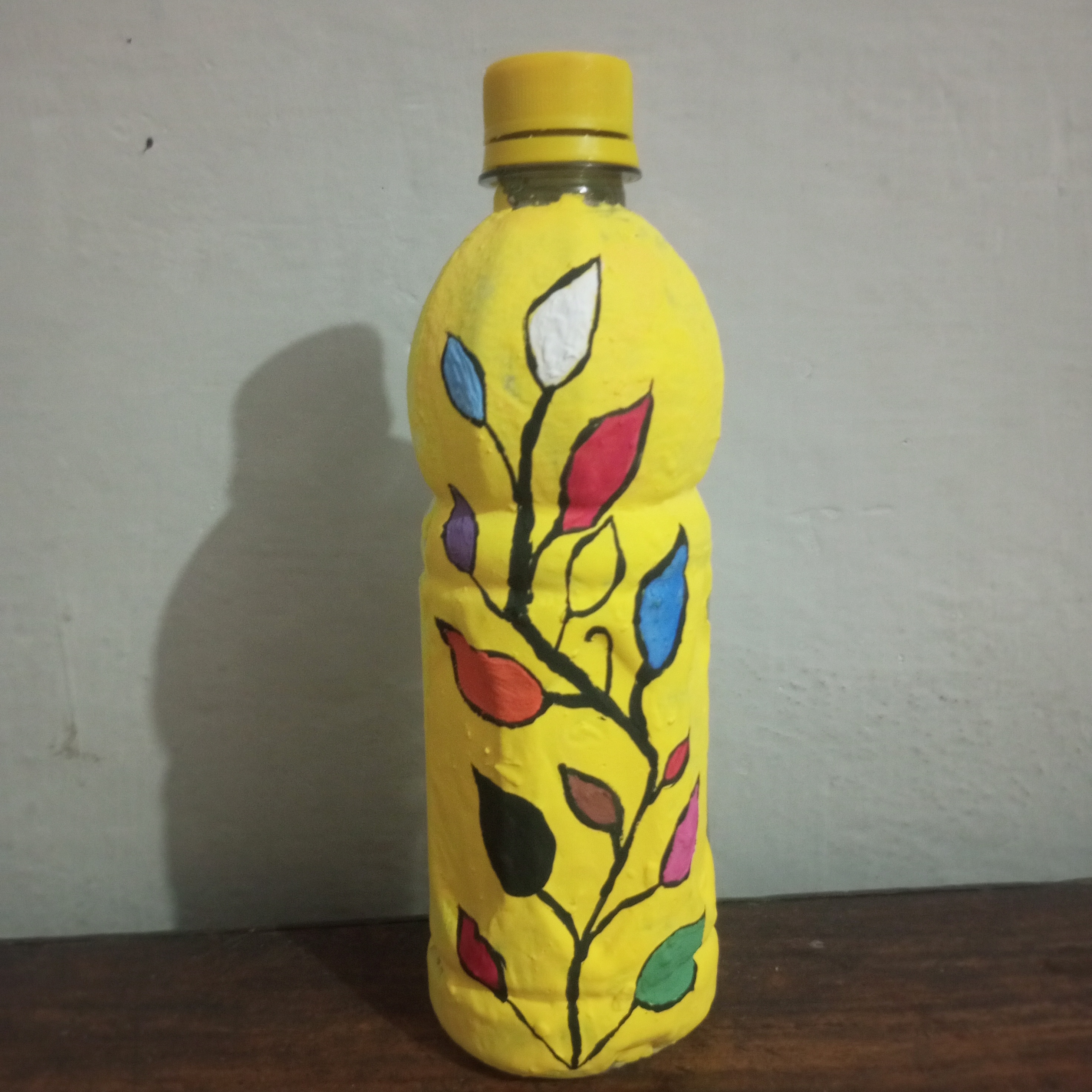 When I began painting my plastic bottle. I first applied a layer of yellow paint. I had assumed that painting on plastic would be simple. But a single coat did not give a good finish. So I patiently and carefully added more layers of yellow paint to achieve a better result.
