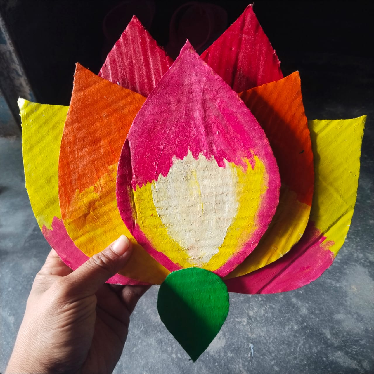 Step-7: When the paint dries well, attach the petals beautifully with the help of glue. Then I attach the petals like leaves at the bottom. When all the petals are attached with the help of glue, my lotus flower is ready.