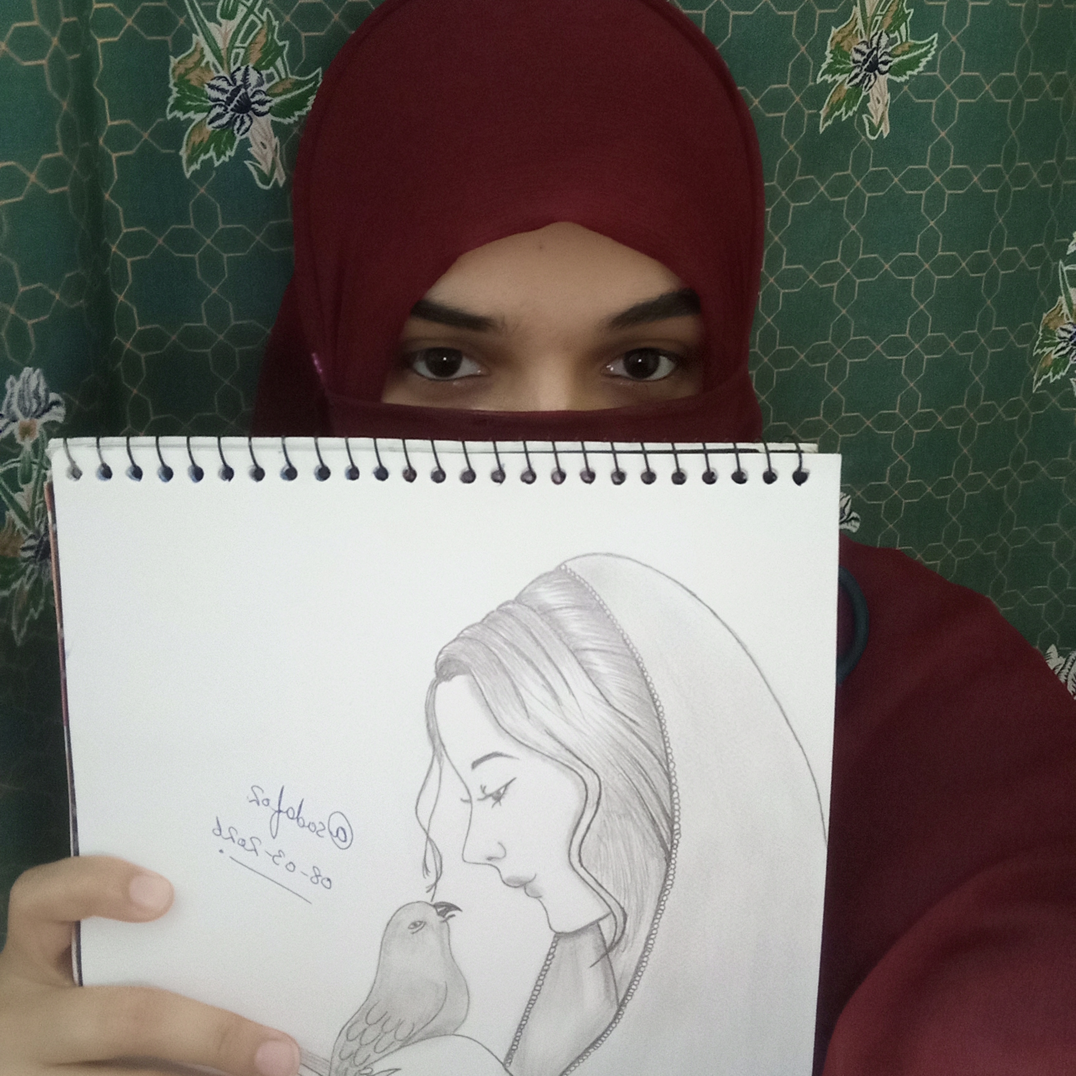 In the last step. I completed all the remaining parts in my drawing. I also finished shading the bird. After shading both the girl and the bird looked much more realistic, beautiful and harmonious in the scene. Then I added a design to the dupatta. I drew tiny white circles all over it. It look like small stones or embellishments. This giving the dupatta a decorative and elegant touch. This detailing enhanced the beauty of the dupatta. It added extra charm and sophistication to the overall artwork. Now my drawing is completely finished. It is ready for its final presentation. It capturing all the soft details and gentle charm I envisioned.