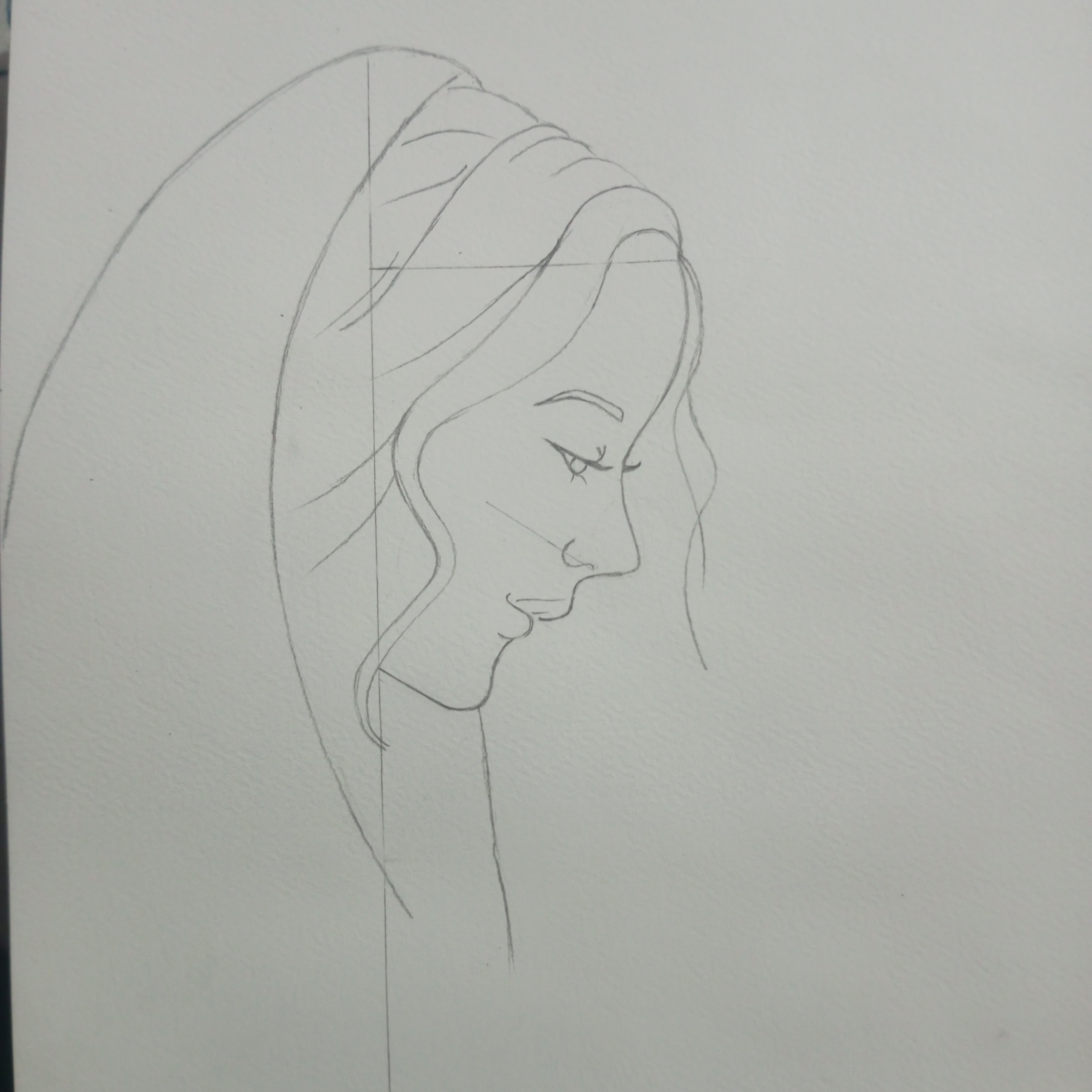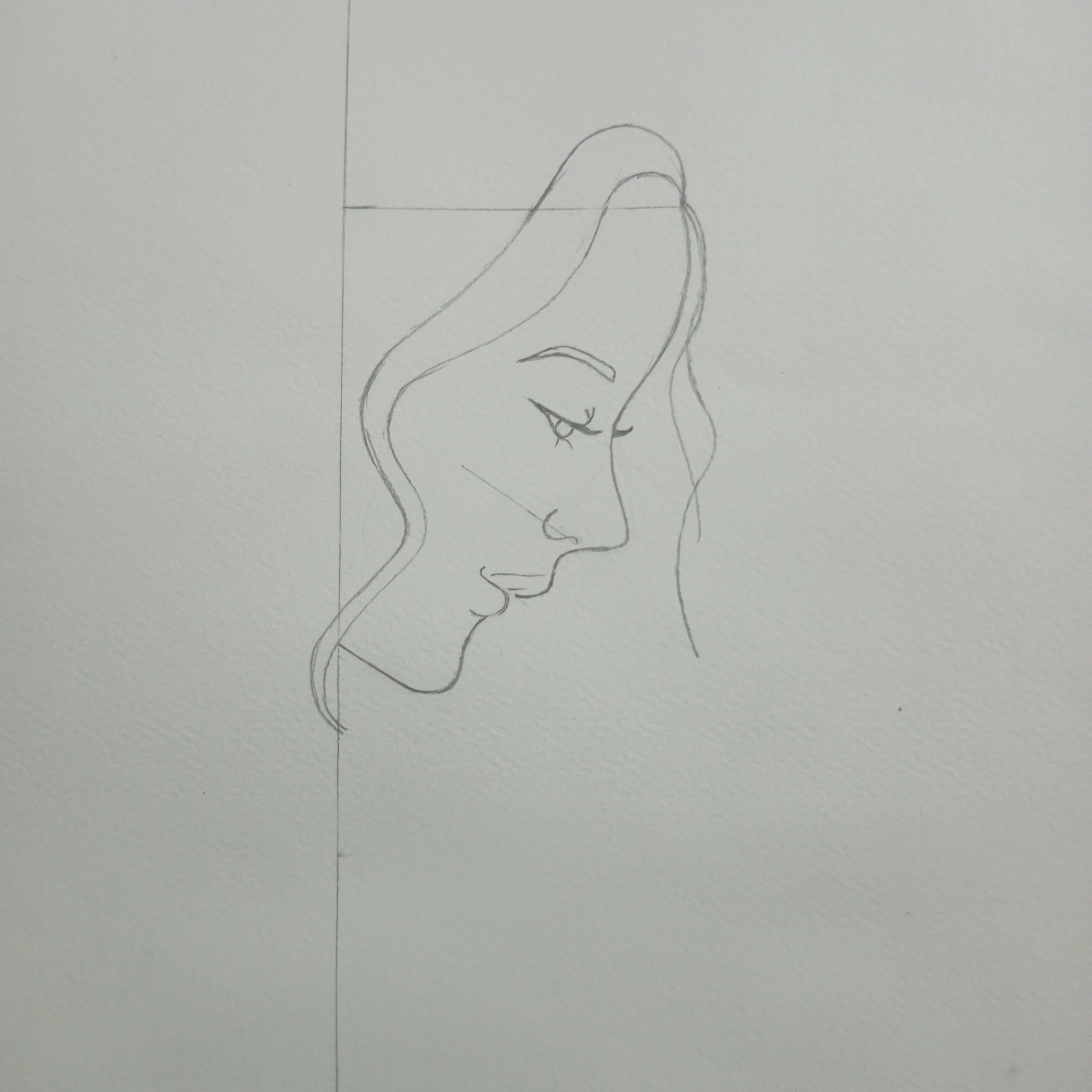 I began by drawing a twenty one centimeter vertical line to guide my artwork. Next I drew a horizontal line to form a box. It helped me set the proportions. Then I started creating my lovely drawing. I beginning with the face carefully shaping the head, nose, lips and chin.