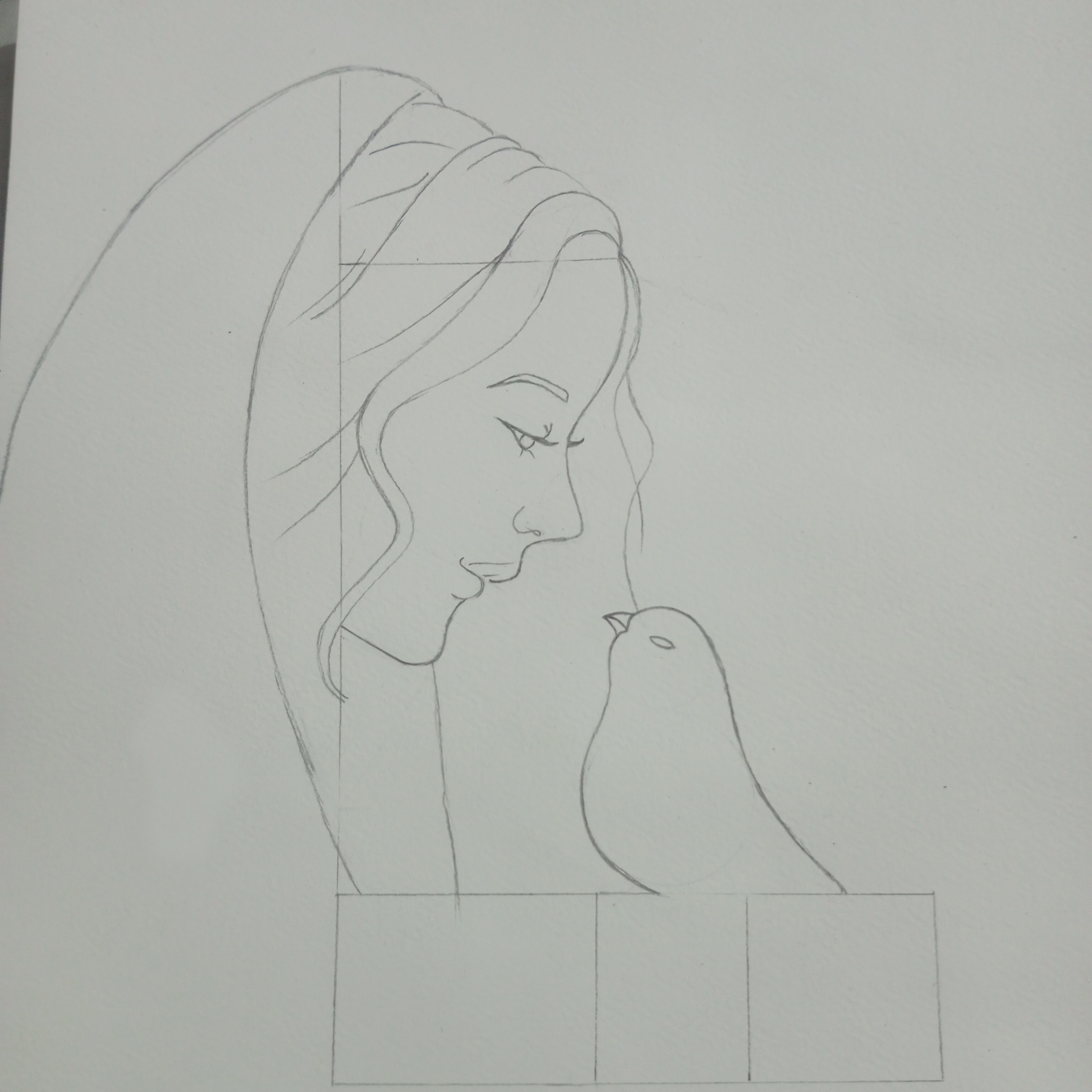 Then I focused on drawing of the bird. I only sketched the shape of the bird. I drew it in such a way that the bird is looking at the girl. She is gently looking back at it. To make the next step of drawing her arms easier. I created a box as a guide. This box will help me place the arms correctly. When I start drawing them later. For now this step is all about carefully shaping the bird and setting the guide for the arms.