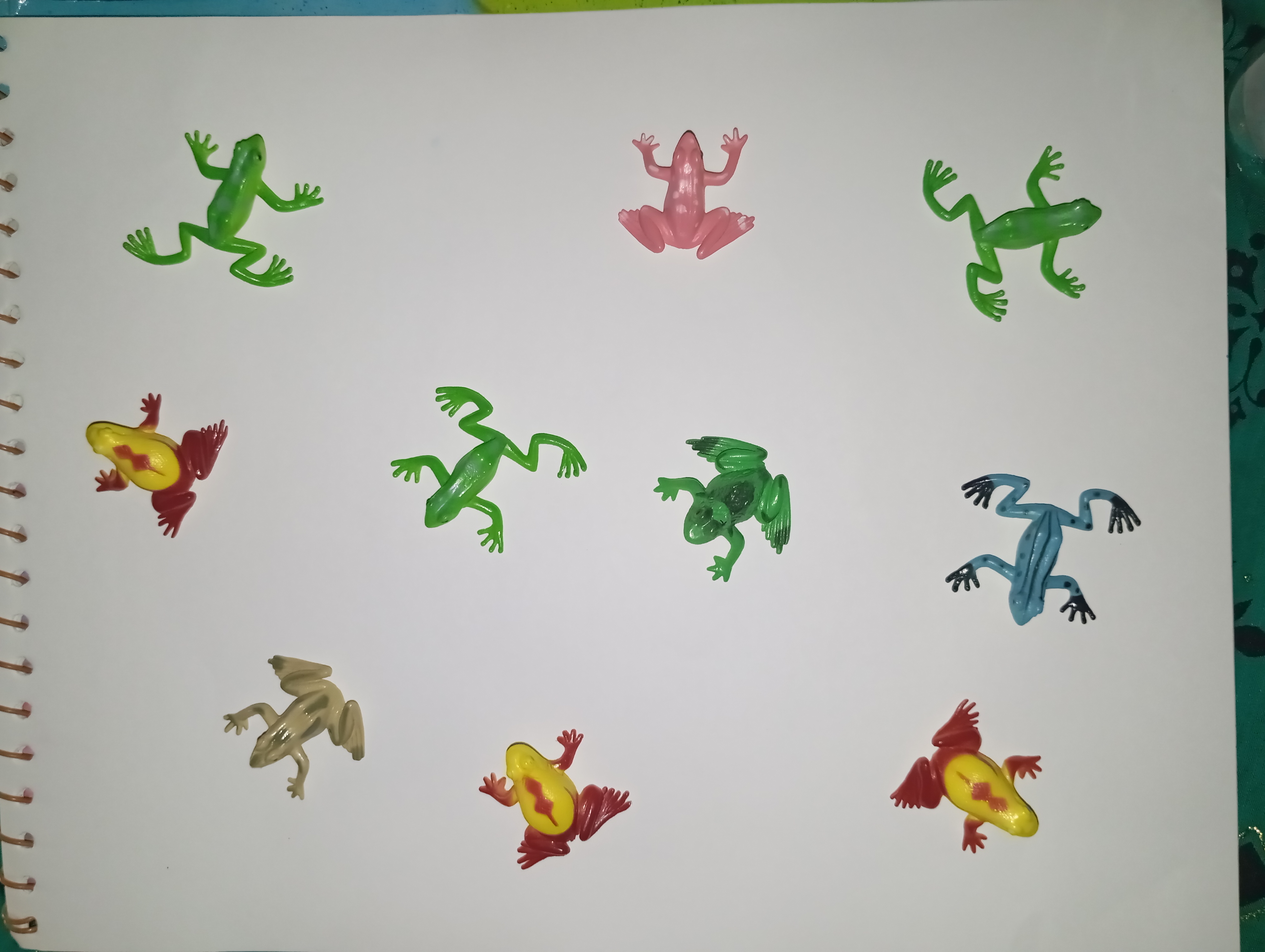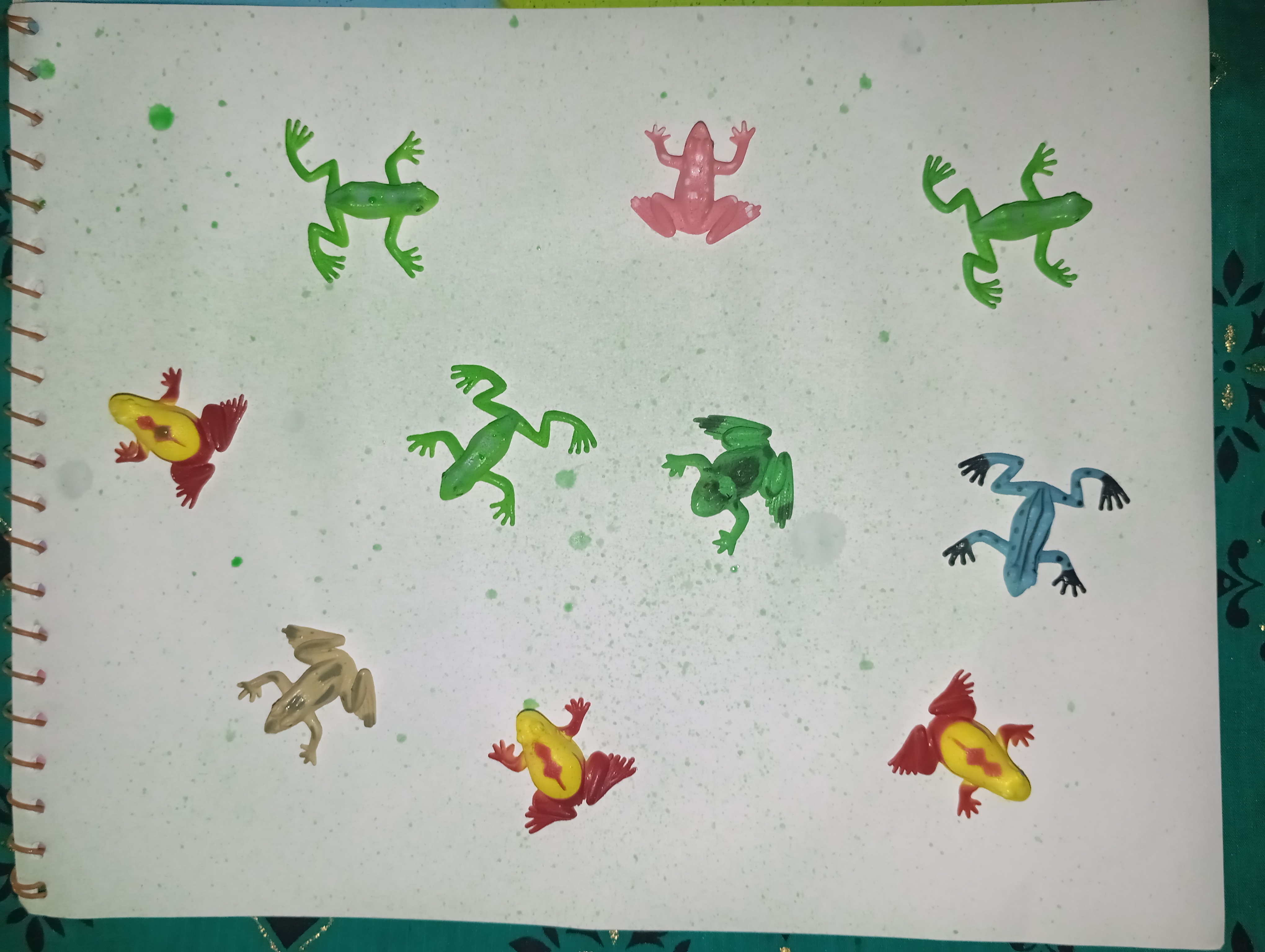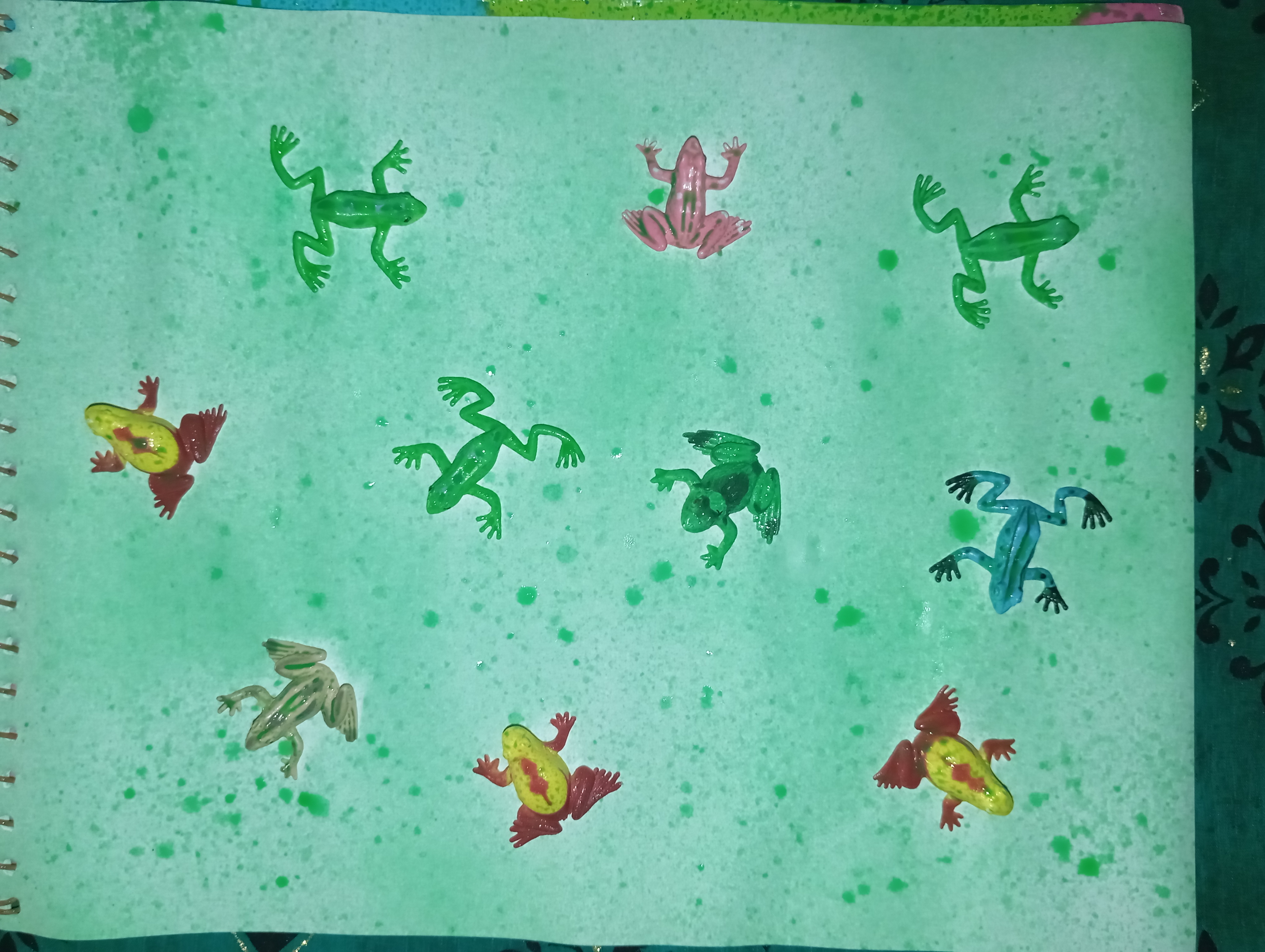 First, I took my sketchbook and placed different colored plastic frogs on its pages. I spaced them on the page slightly apart to create their beautiful shadows later.
