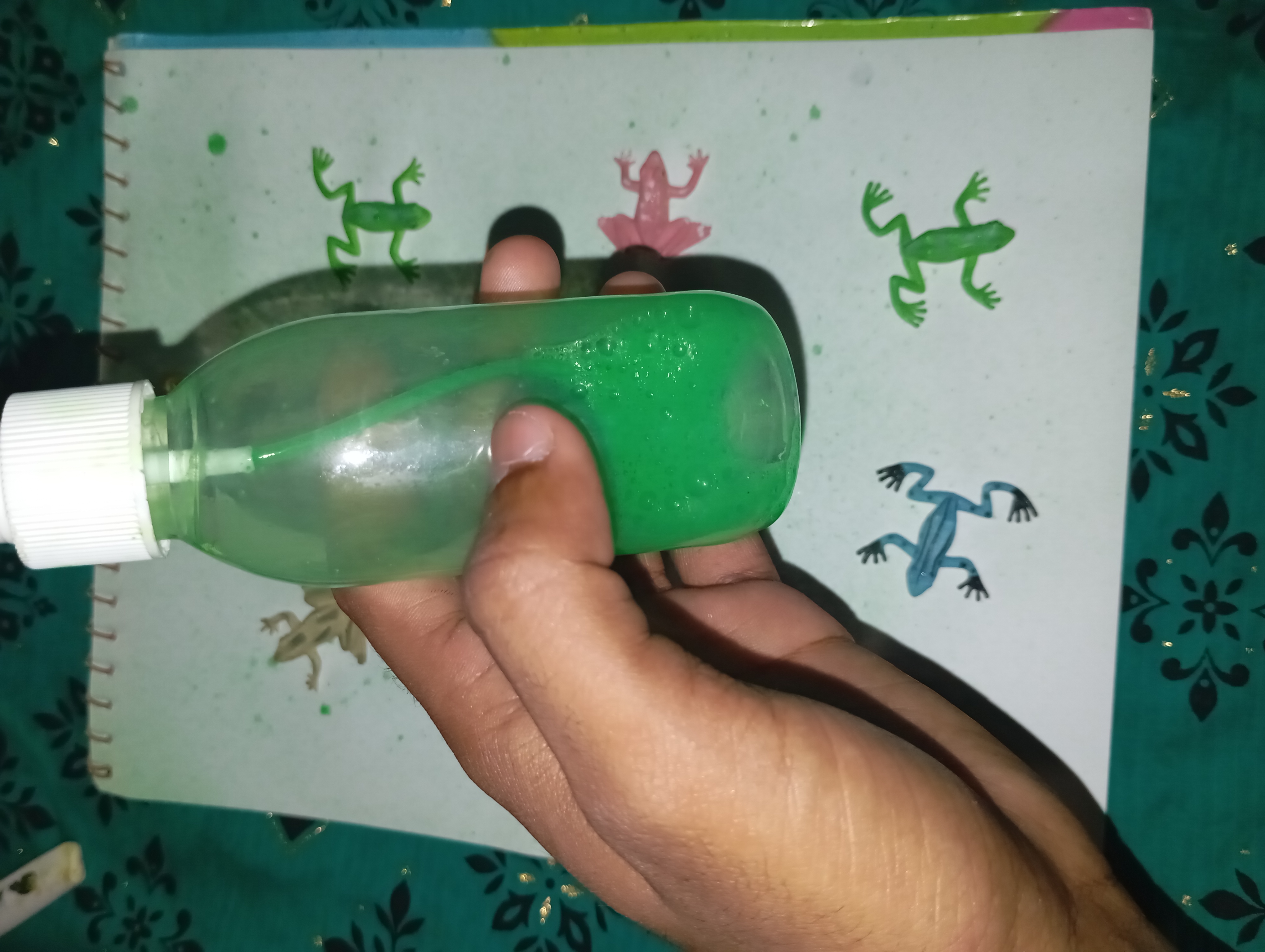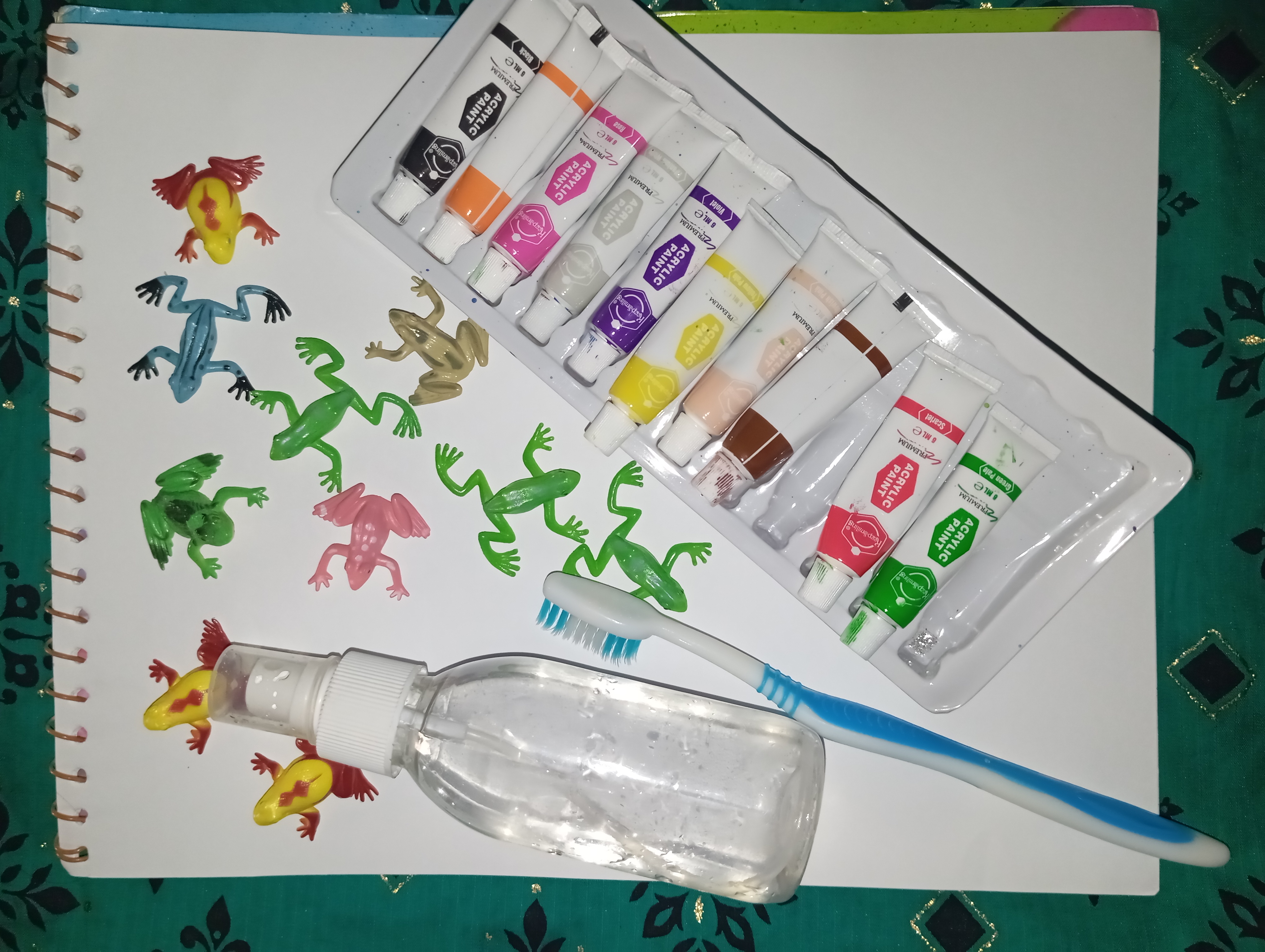 After that I waited some time for the paint to dry thoroughly. After about ten minutes I slowly picked up the plastic frogs.