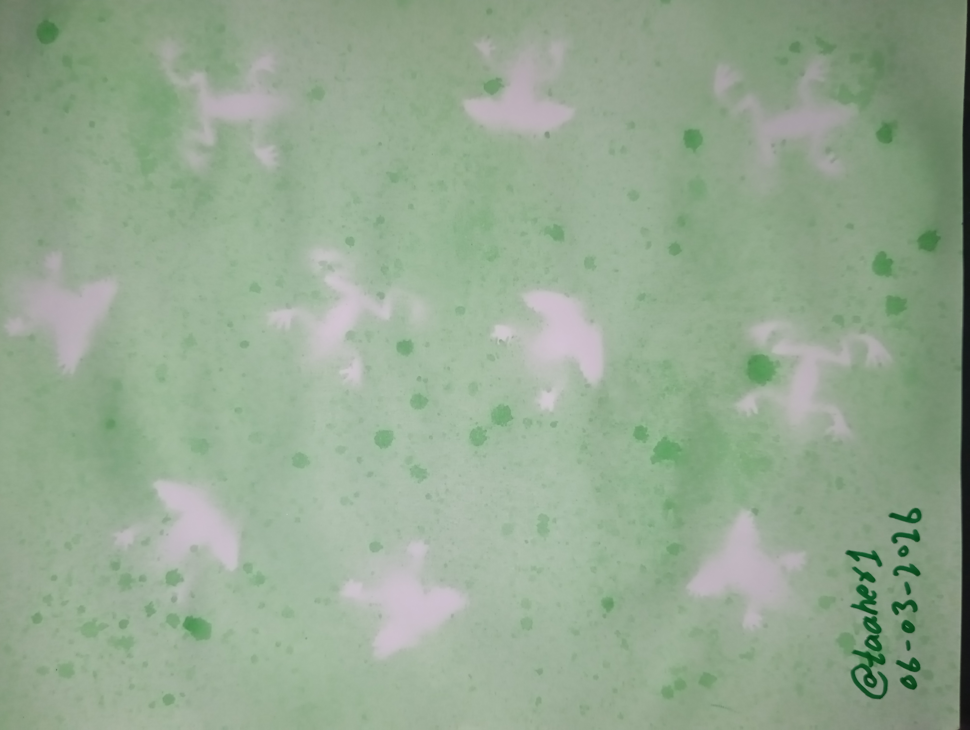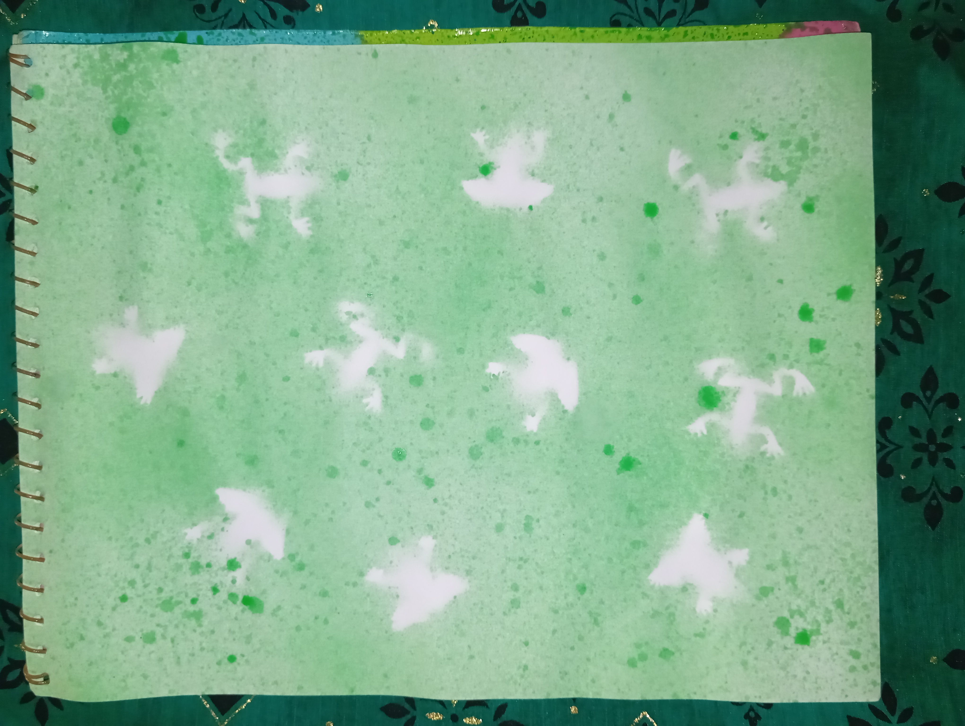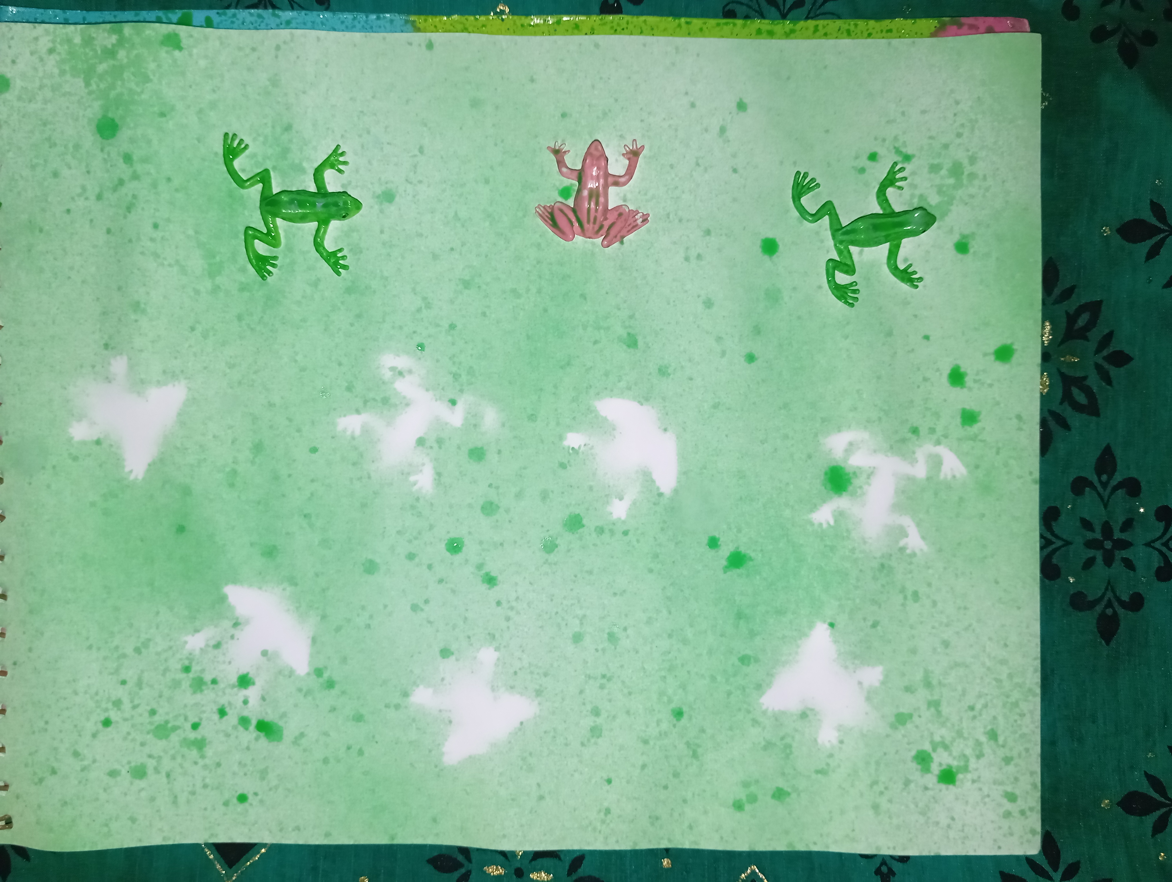 When I removed the frogs, they were replaced by white shadows. I was very happy to see this because the real beauty of spray painting is that the color does not reach where the object is placed and a beautiful shape is created.