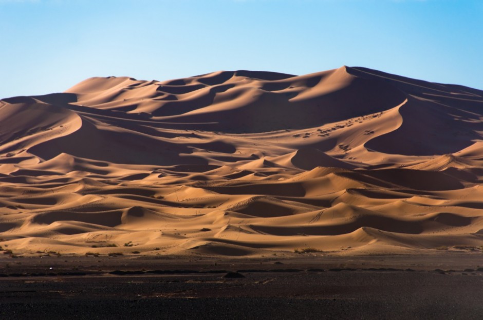 The Sahara, which carpets a large part of Northern Africa, is the third-largest desert in the world. Winds and sporadic rainfall have shaped the Sahara into a landscape of dunes, valleys, flats, and sand seas. Oases infringe on the parched expanse, nourished by water from the desert’s underground aquifers.