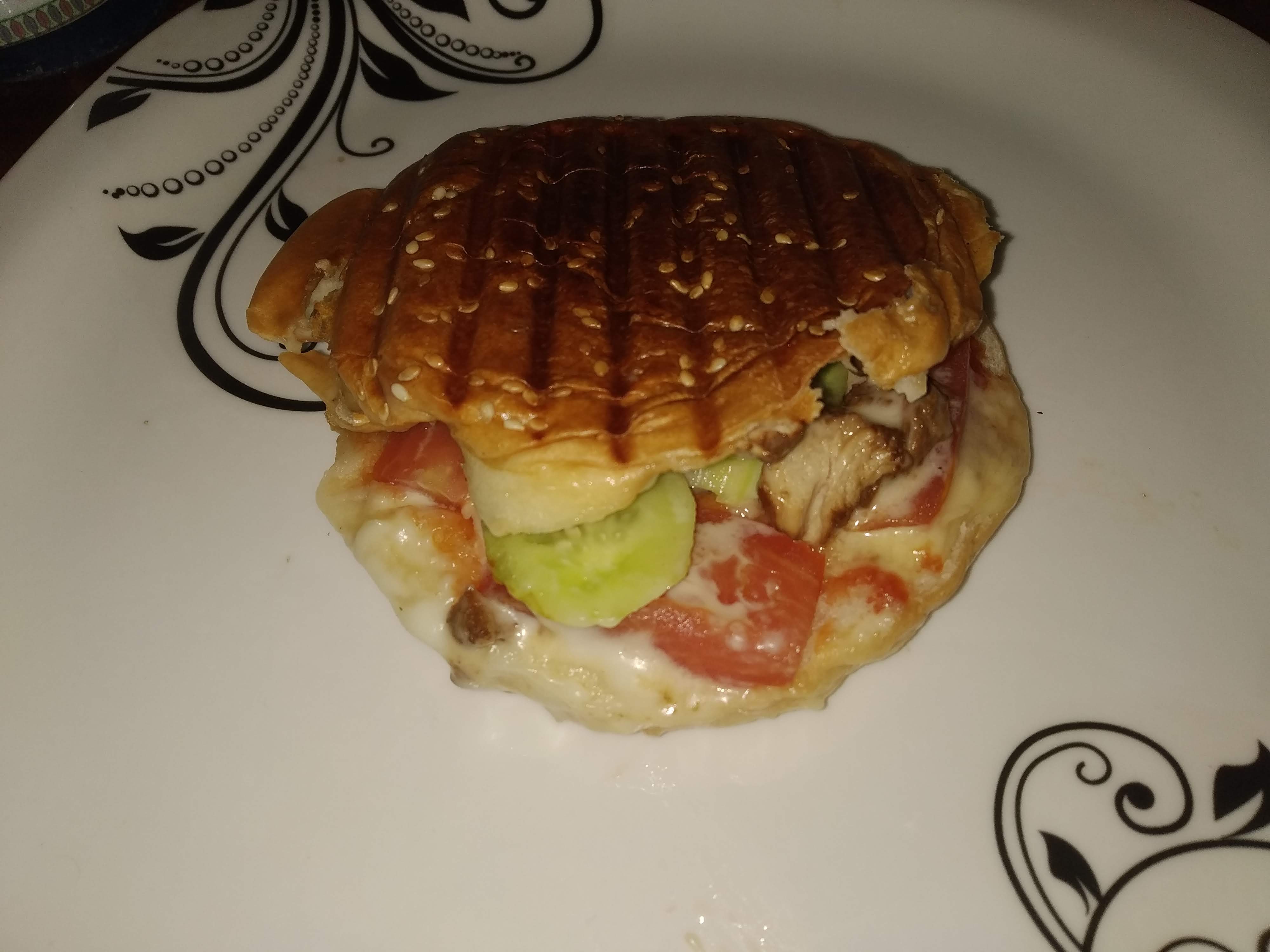 প্রথমে বার্গারের রুটি দুই ভাগ করে কেটে নিব তারপর দুইপাশে বাটার দিয়েছি এবং বার্গারের রুটির ওপর এর পাশে টমেটো কেচাপ দিয়েছি এবং নিচের নিচের পাশে মেয়োনিজ দিয়েছি। এরপর টমেটো, শশা এবং সবার উপরে সবার উপরে চিজ দিয়েছি এরপর এটা স্যান্ডউইচ মেকারে গরম করে নিয়েছি তাহলেই হয়ে গেল।