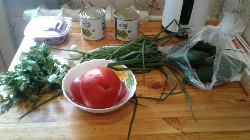 🔥Ну сегодня-то точно буду кушать салат: вчера съел все нектарины и инжирные персики, насытился сладостями, пора переходить на овощи, так сказать восстановить баланс между вкусами. Помидоры купил ещё вчера, огурцы и зелёный горошек приобрел сегодня в супермаркете, по пути на улице взял зелёный лук и петрушку деревенскую у бабушек. Салат получился отменным!