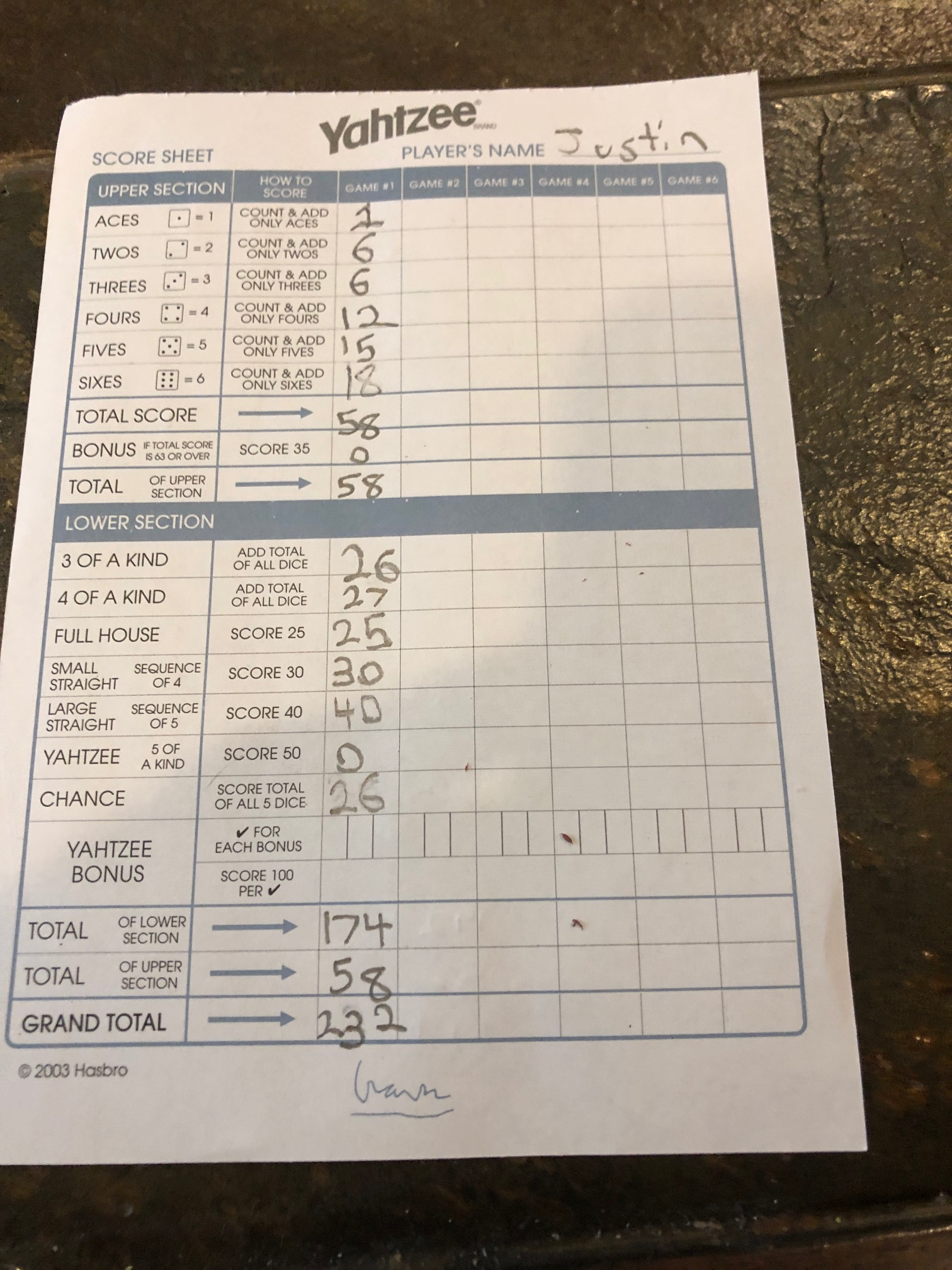 Before my mom left to pick up our groceries, I played a second game of Yahtzee with her. Of course I won yet again. See my scorecard below: