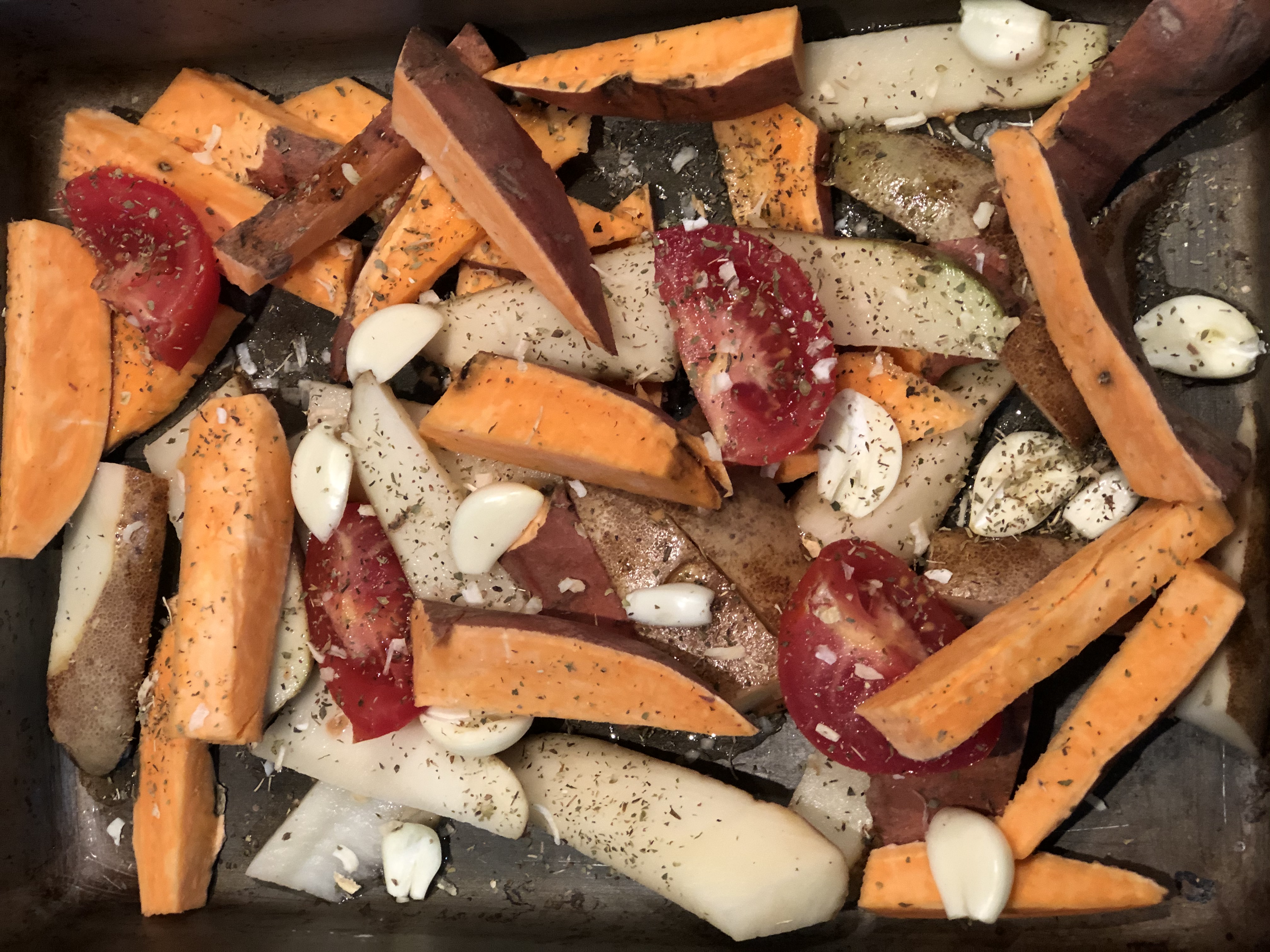 When in doubt, bake! Sweet potatoes are not only good for you, they're delicious :) Add some regular potatoes for contrast, plus garlic (immune booster & tasty roasted) and a juicy red fruit, aka tomatoes, drizzle oil and spice to taste (oregano, salt, pepper, etc...)